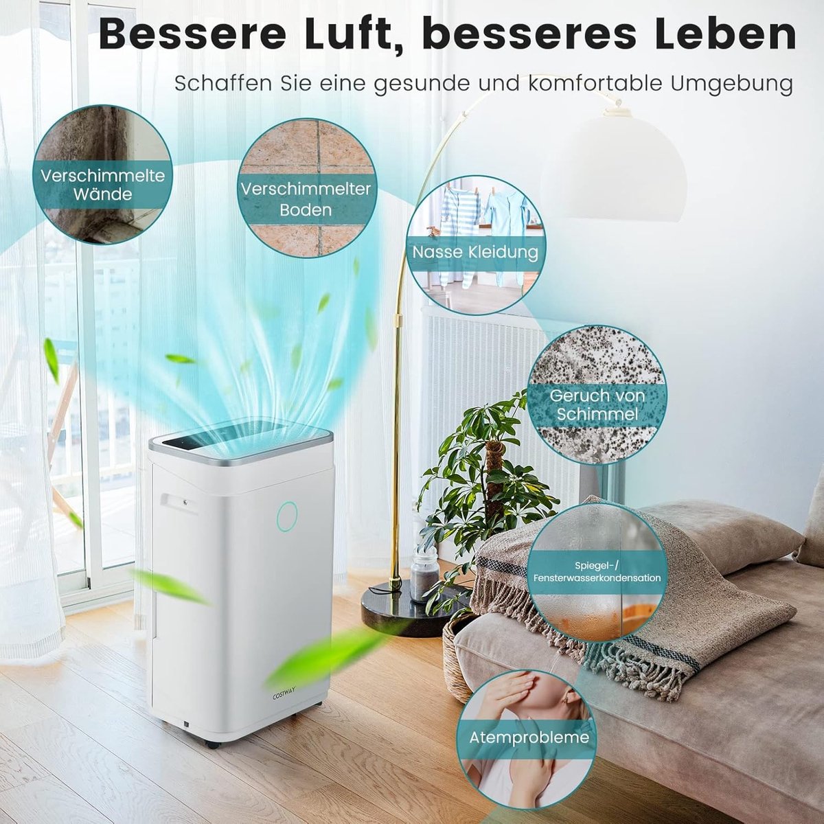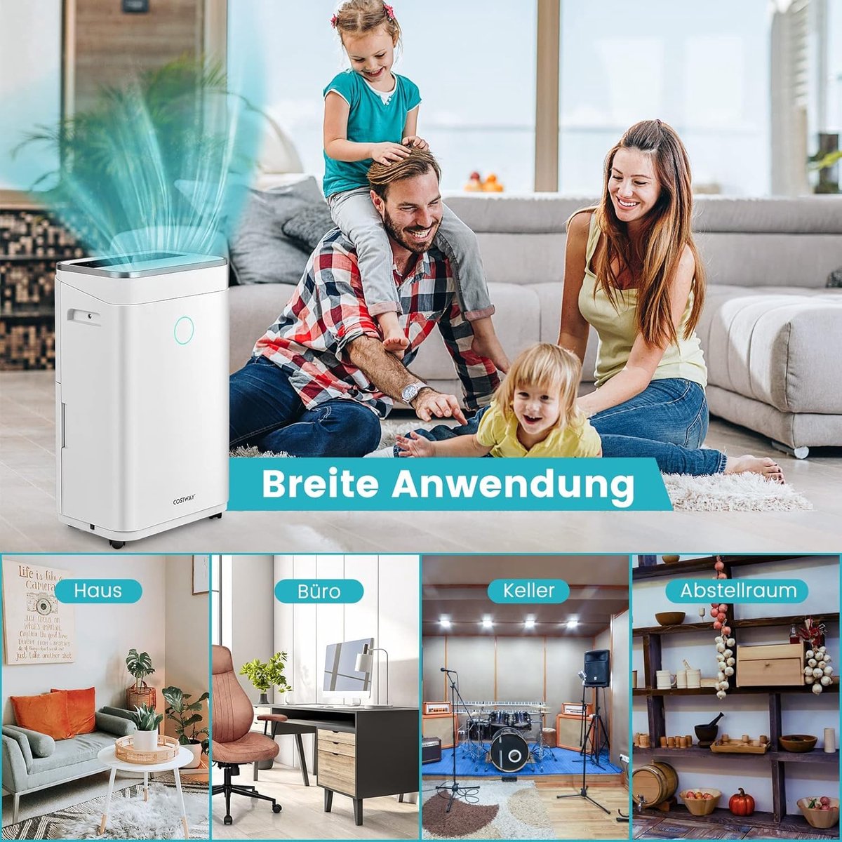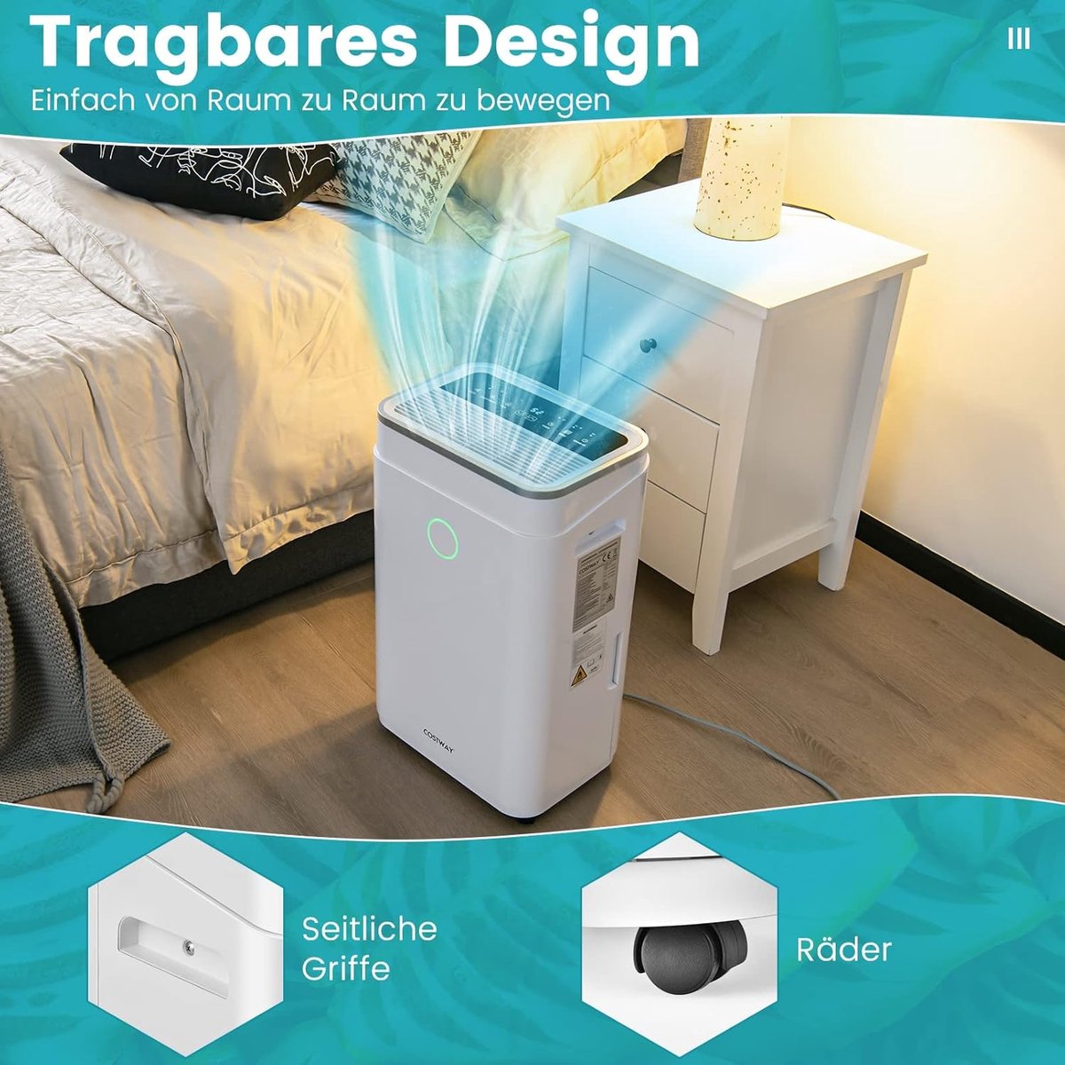 Onze krachtige ontvochtiger is perfect voor je huis, omdat hij voor frisse lucht zorgt. Dankzij het bedieningspaneel en led-display is hij zeer eenvoudig te gebruiken. Bovendien wordt het vocht via een driekleurige lamp weergegeven. De ontvochtiger heeft twee bedrijfsmodi en 2 snelheden, die naar behoefte kunnen worden gekozen. Naar behoefte kan het water handmatig of constant worden afgevoerd. Bovendien is er een slaapmodus en een 24-uurs timer. De kinderbeveiliging is ook zeer praktisch. Dankzij de handgrepen en wielen is een eenvoudige beweging mogelijk, waardoor het apparaat geschikt is voor thuis, kantoor, enz.