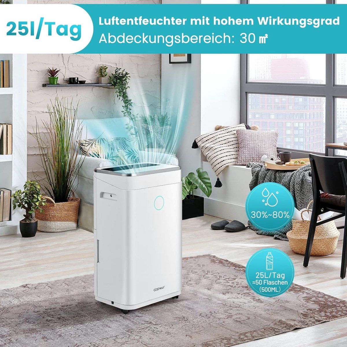 Zeer efficiënte luchtontvochtiger transporteert dagelijks tot 25 liter vocht af.