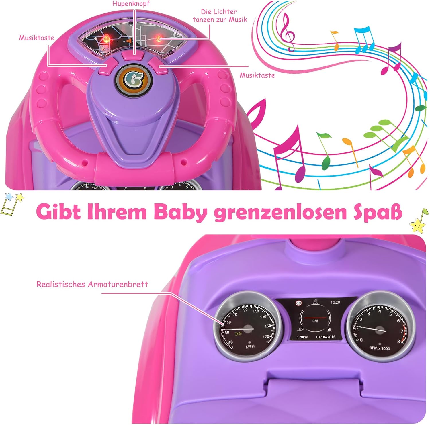 Dit autospeelgoed combineert de functies van een kinderwagen, loopauto en een zitauto voor eenvoudig duwen, trekken en glijden. Je kleine engel kan de auto alleen duwen, of je kunt de auto met een afneembare stuurstang bedienen. Slijtvaste wielen, veiligheidsleuningen en een valplank bieden voldoende bescherming om de veiligheid van kinderen tijdens het rijden te verhogen. Als kinderen klein speelgoed, snacks of andere voorwerpen willen vervoeren, is de verborgen opbergruimte onder de stoel precies wat je zoekt. Functies zoals een ergonomische zitting, geïntegreerde muziek, claxon en stuur zorgen voor een prachtige en spannende rijervaring. Het is een ideaal cadeau voor je kind van 1 tot 3 jaar.