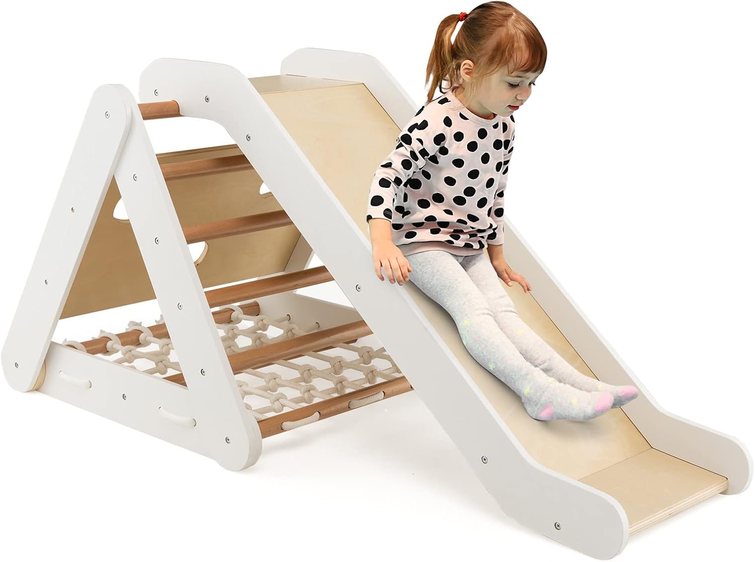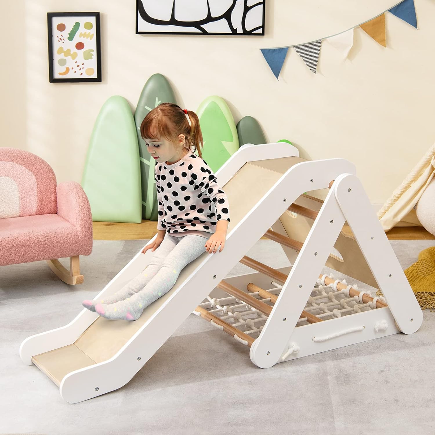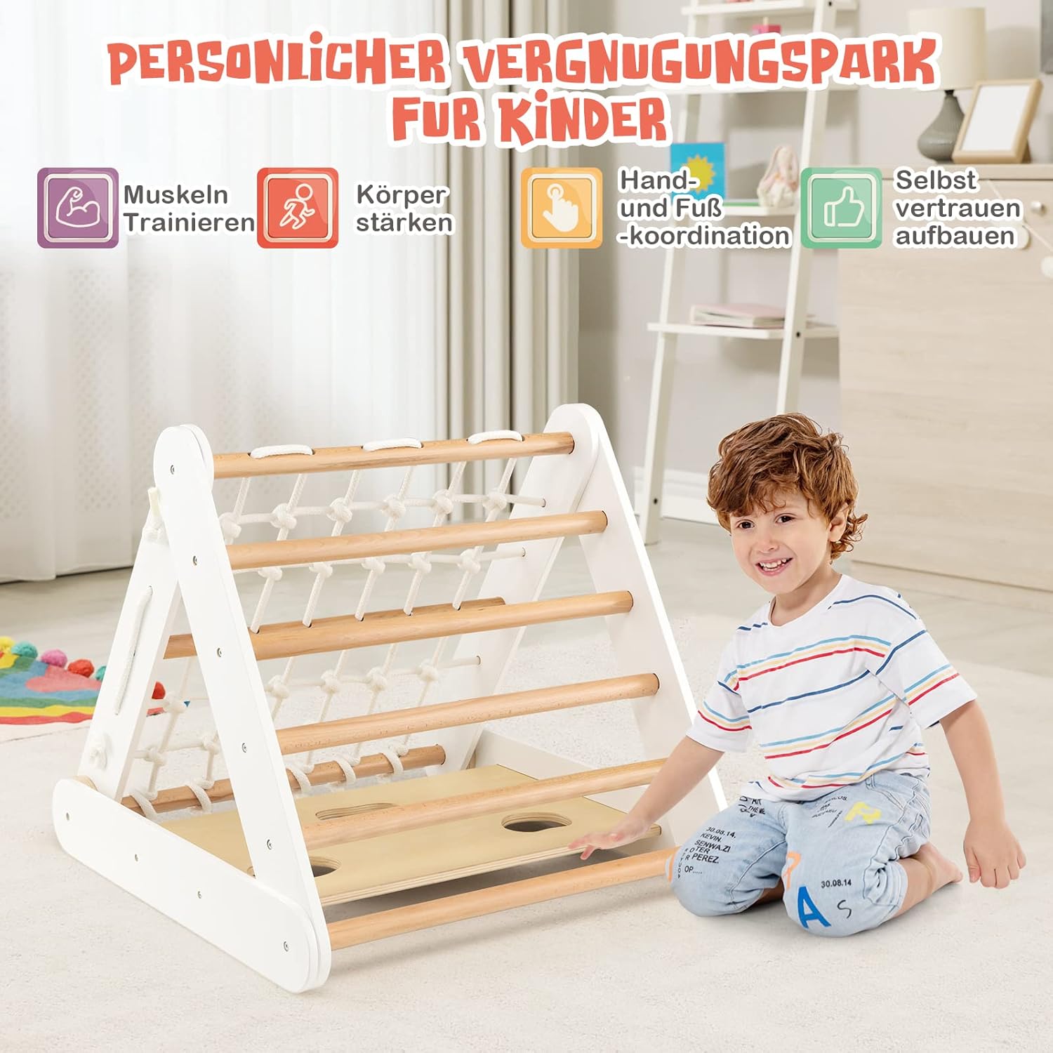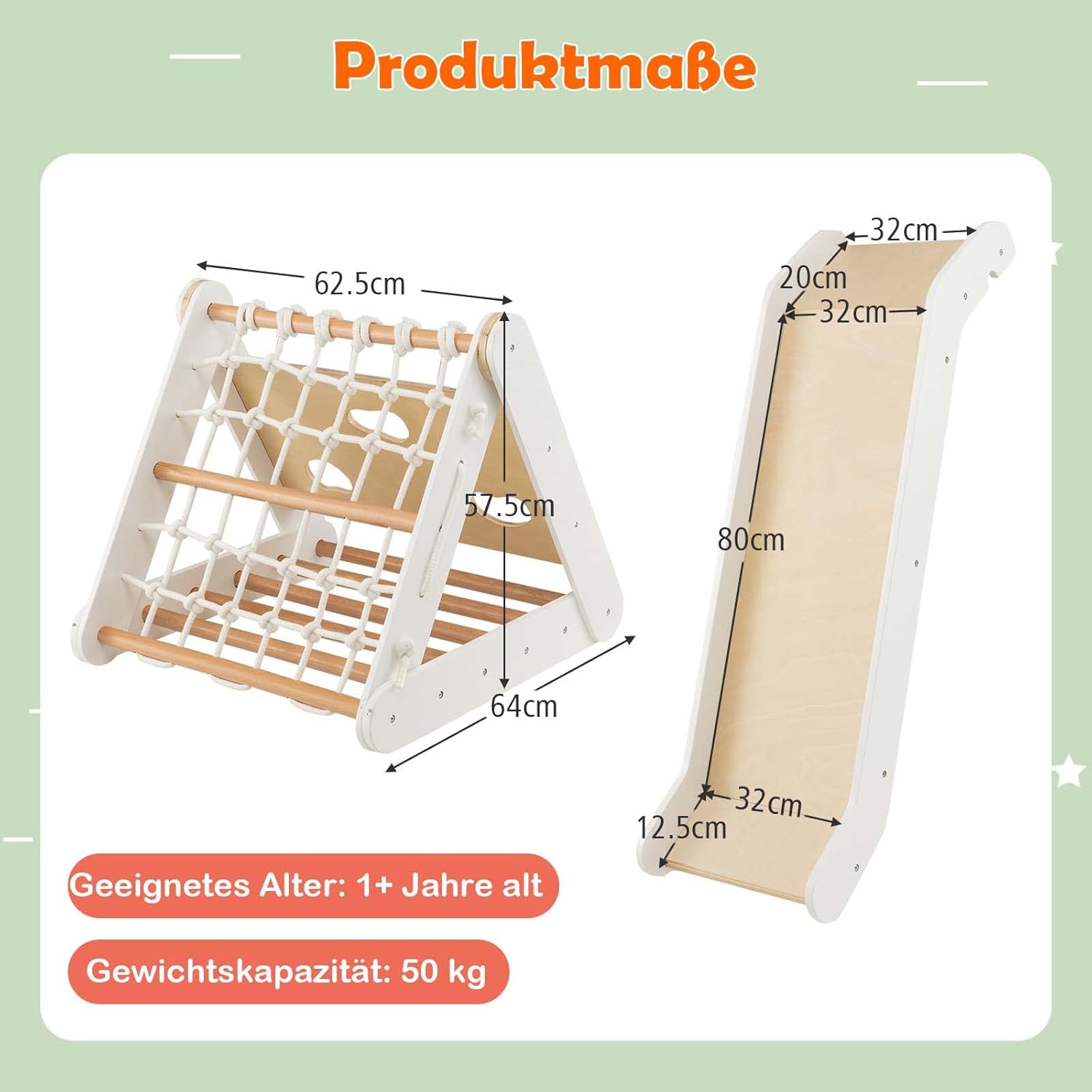 3-zijdig klimrek met helling: het driehoekige klimrek heeft een klimladder, een klimplank en een sterk klimnet, en deze 3 verschillende kanten brengen je kinderen continu plezier. Bovendien kan dit product met de meegeleverde helling worden gebruikt om te glijden.