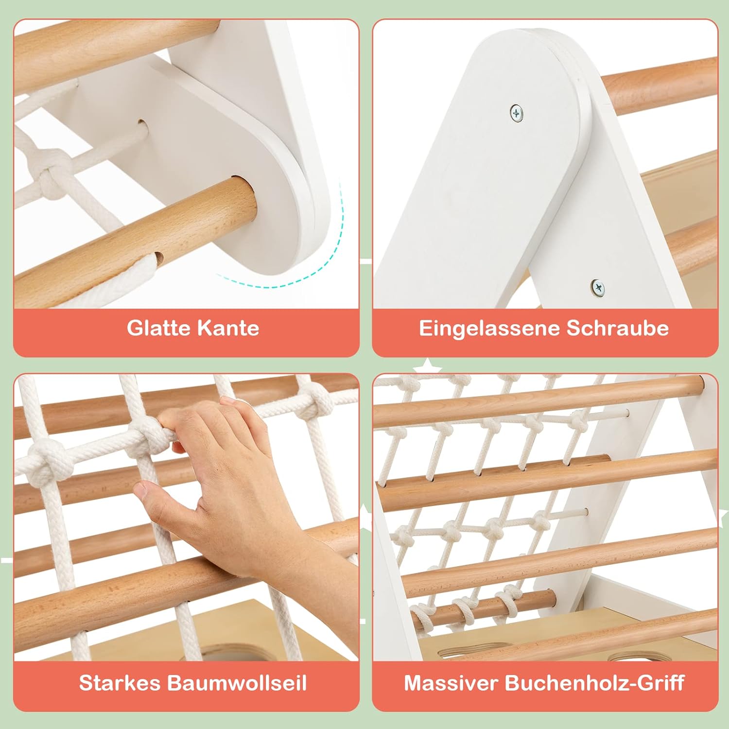 Gebouwd voor de veiligheid van kinderen: met een stabiele driehoekige structuur wiebelt het 3-zijdige klimrek niet zo gemakkelijk. Bovendien beschermen de verborgen schroeven en het gladde oppervlak kinderen tegen krassen en zijn ze gemakkelijk te reinigen. En de afgeronde hoeken maken het ook veiliger.