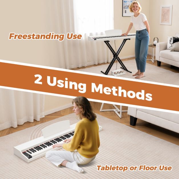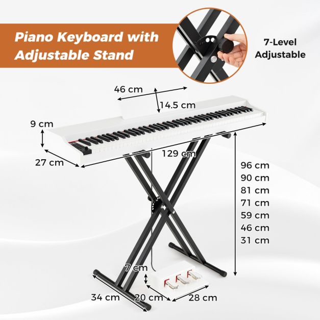 Je kunt net als op een echte piano spelen!Indrukken voor een zachter geluid, demperpedaal: indrukken om het dempingseffect te verminderen, sustainpedaal: indrukken om de pianonoten te laten resoneren), kunt u spelen zoals op een echte piano. De verstelbare standaard biedt de optimale zithoogte voor verschillende personen.