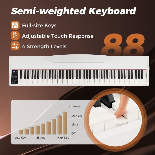 【Semi-gewogen toetsenbord en pedalen】: het toetsenbord van de piano heeft 88 standaardtoetsen van volledige grootte om het gevoel van een echte piano te simuleren. Er zijn 4 sterktegraden voor de aanpasbare aanslaggevoeligheid. Daarnaast zijn er drie pianopedalen (softpedaal, sostenutopedaal en sustainpedaal) om het geluidseffect te wijzigen.