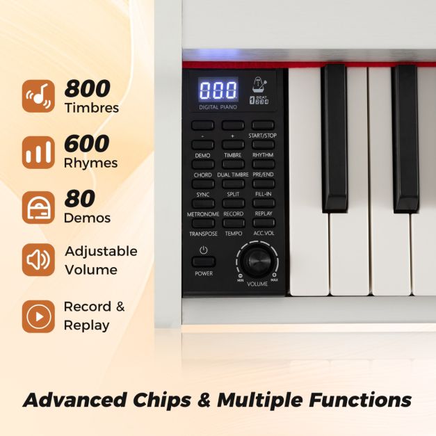 【Geavanceerde chips en meerdere functies】: met hoogwaardige chips biedt de elektrische piano 800 klankkleuren, 600 ritmes en 80 demosongs voor een creatieve speelervaring. Bovendien kunt u met de opname- en afspeelfunctie genieten van uw eigen creaties.