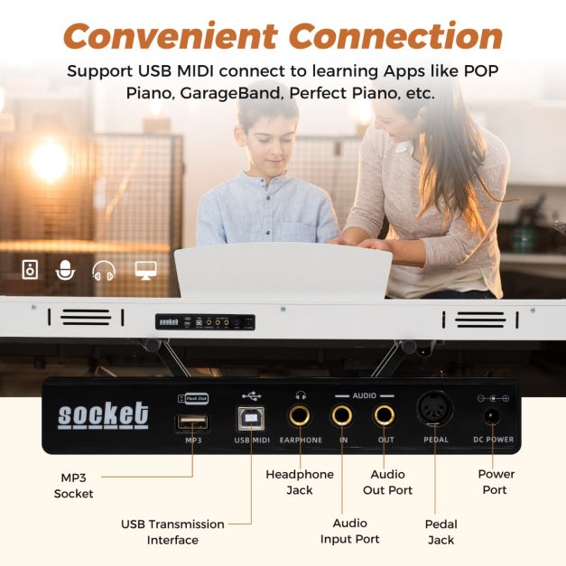 【Eenvoudige en handige aansluiting】: er zijn verschillende aansluitingen die compatibel zijn met stroom, hoofdtelefoons en pedalen. Bovendien kan de piano worden aangesloten op computers, tablets en meer. Het toetsenbord ondersteunt USB-MIDI-verbindingen met leer-apps zoals POP Piano, GarageBand, Perfect Piano, enz.