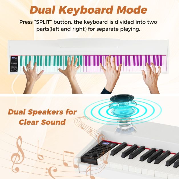 【Dual-keyboardmodus & luidsprekers】: De dual-keyboardmodus maakt interessant duetspel mogelijk. Met de ‘SPLIT’-knop wordt het toetsenbord in twee delen (links en rechts) verdeeld om afzonderlijk te kunnen spelen. Dubbele luidsprekers van de piano zorgen ervoor dat u verschillende geluiden duidelijk kunt horen.