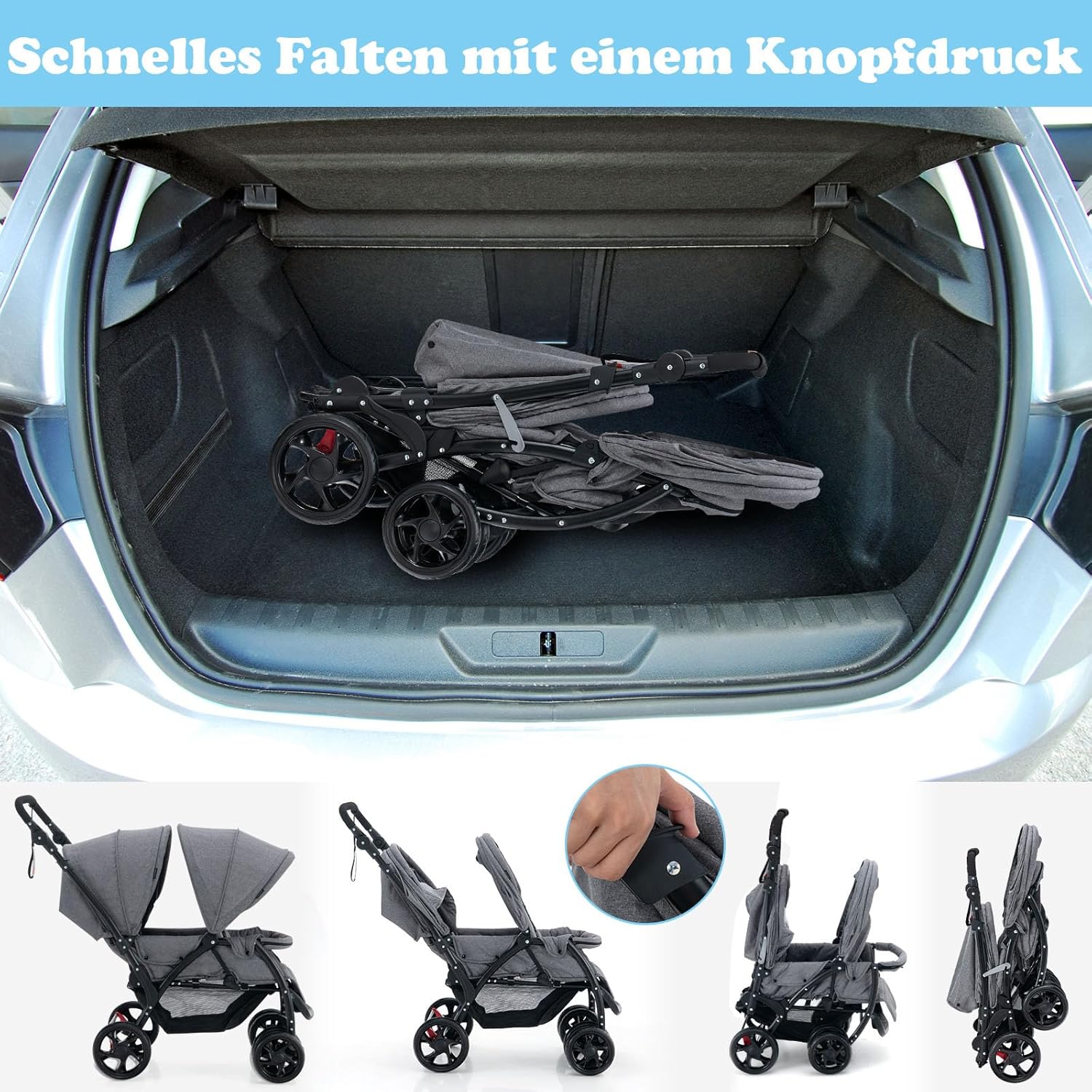 Onze comfortabele broer en zussenwagen ziet er zeer mooi uit en zorgt voor een goed zicht op de achterbank. De 5-punts veiligheidsgordels zijn uitgerust met zachte schouderkussens. De kinderwagen is eenvoudig inklapbaar en kan bij elk weer worden gebruikt. De grote boodschappenmand onder de zitting biedt ook veel ruimte voor grotere spullen, zoals tassen en jassen. Het is de perfecte metgezel voor dagelijkse dingen en op reis.