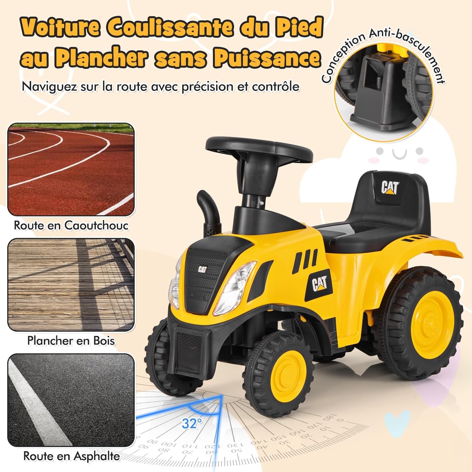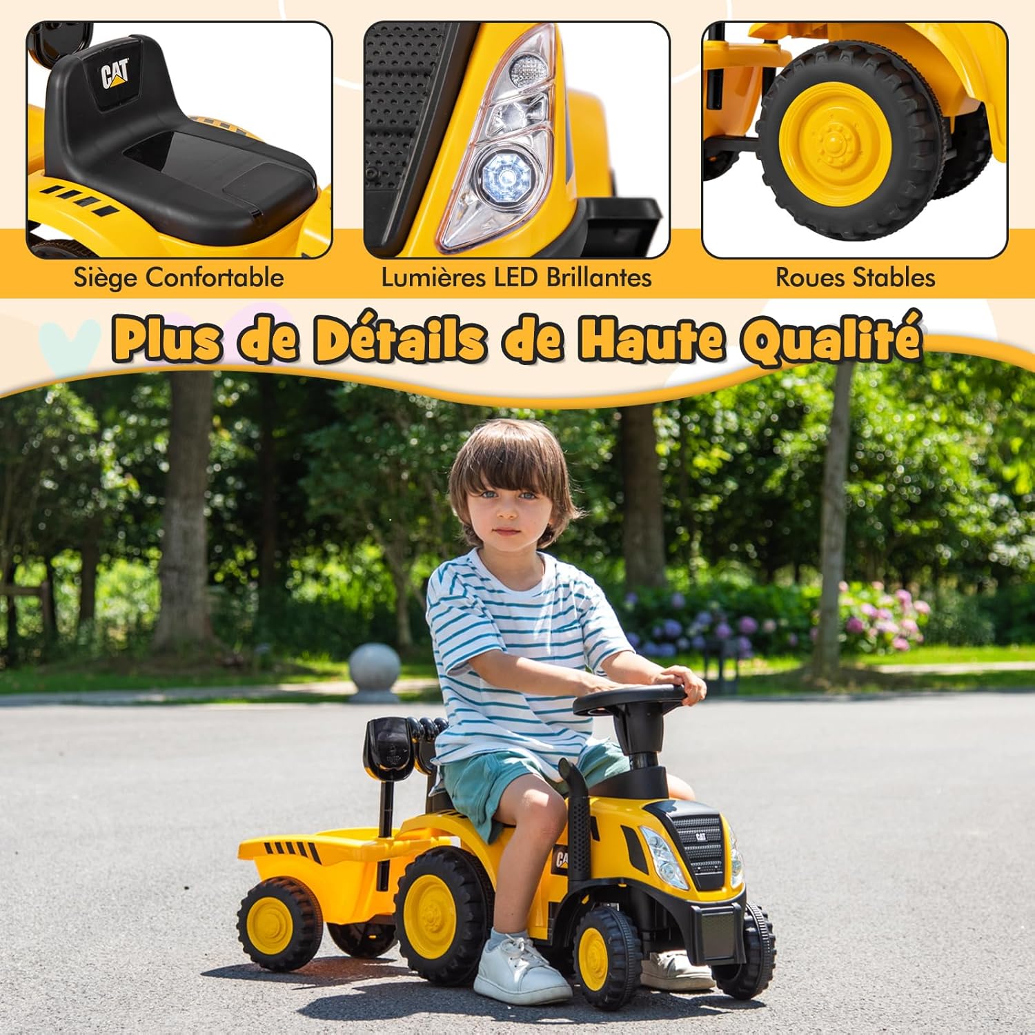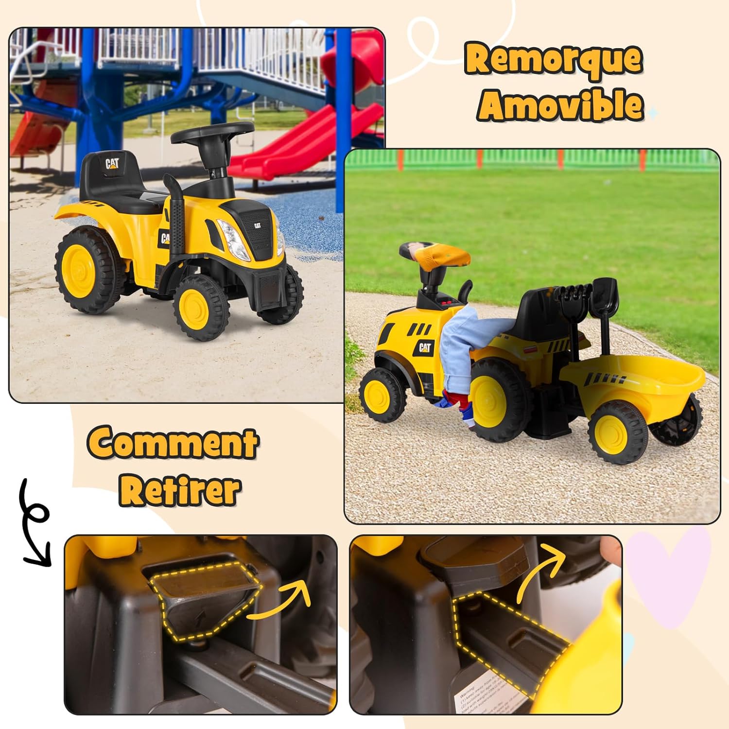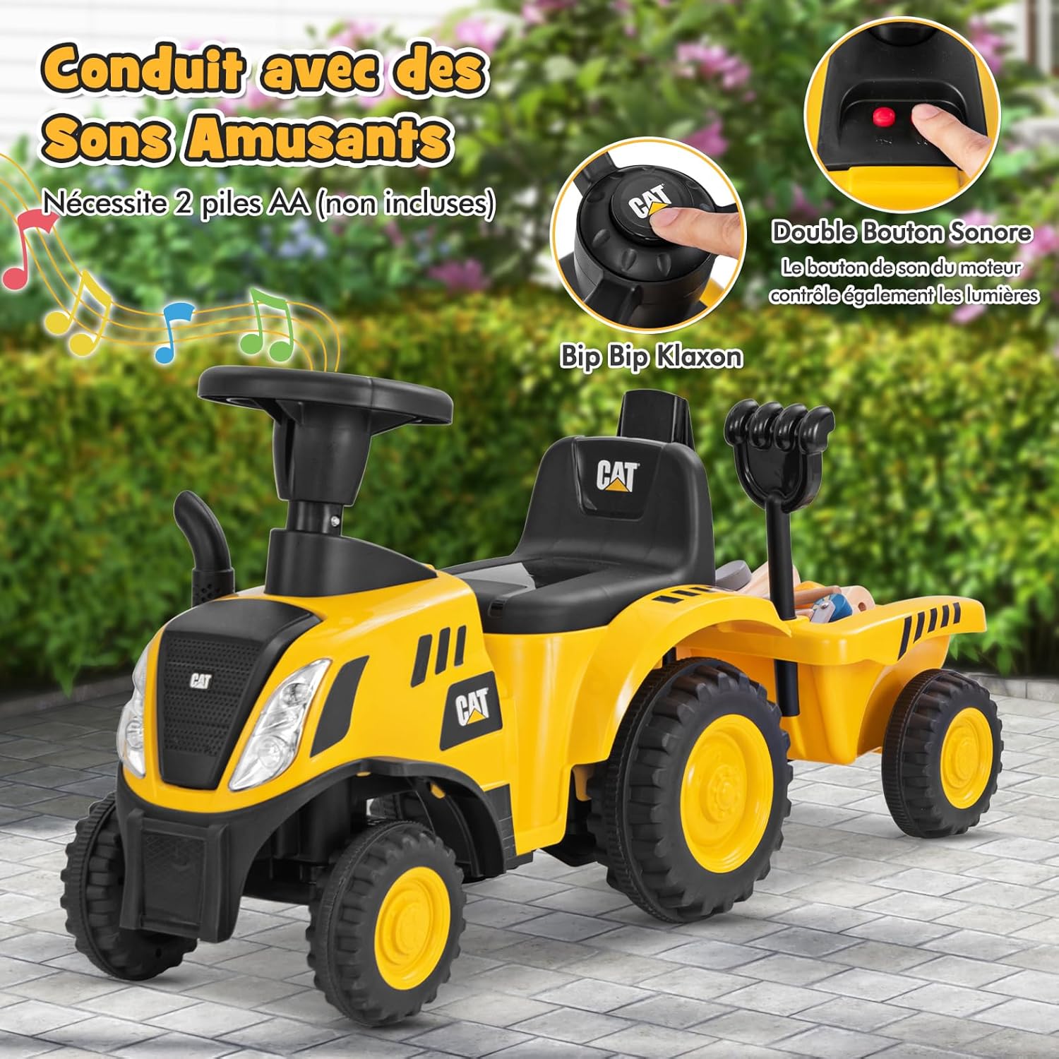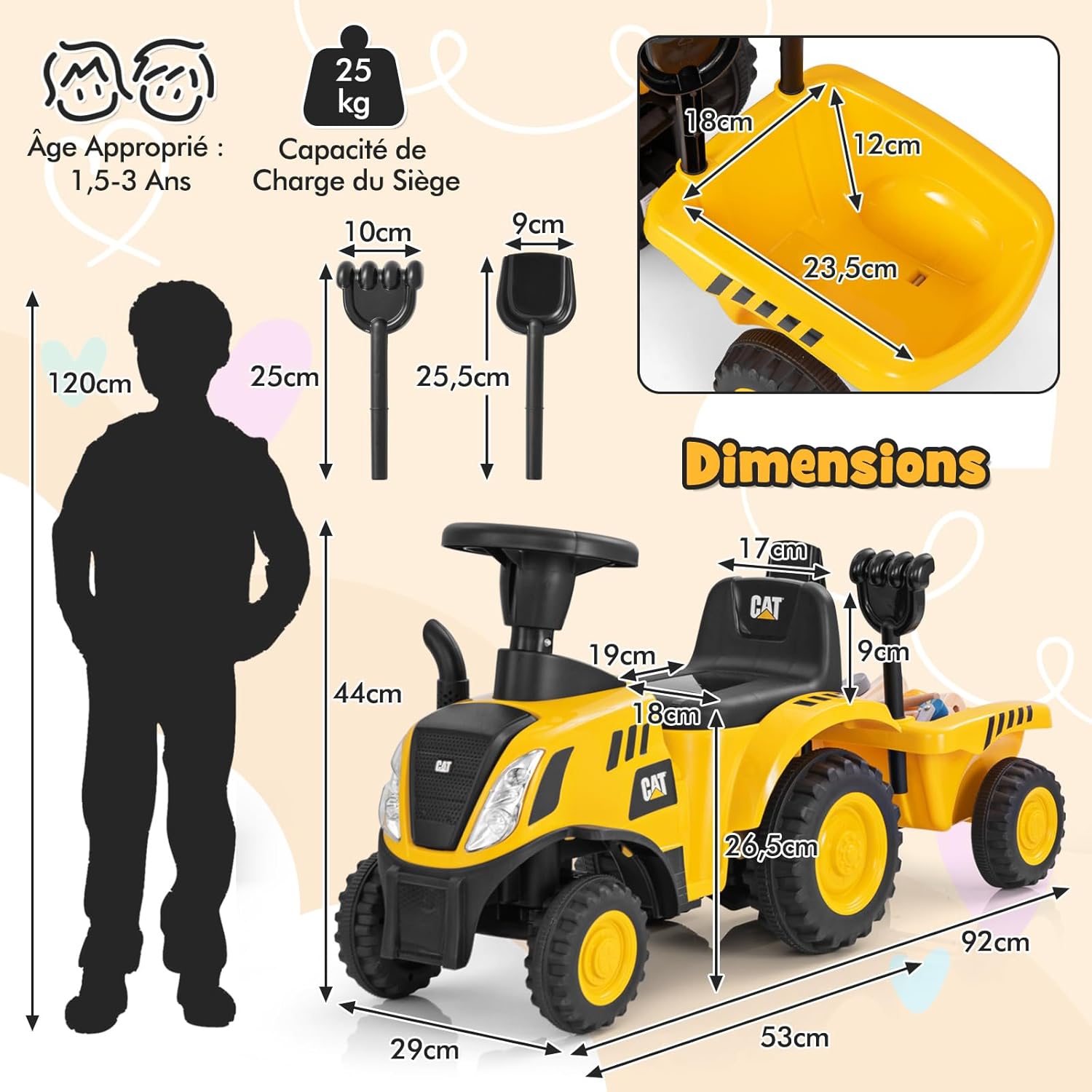 Onze gelicentieerde Caterpillar kindertractor beschikt over een pieptoon en de dubbele geluidsknoppen maken het mogelijk om kinderen met grappige geluiden te rijden. De ledlampen worden bestuurd door de geluidsknop van de motor. De afneembare aanhanger is perfect voor het vervoer van schatten. De hark en een schep verbeteren het spel en bevorderen tegelijkertijd de fijne motoriek.
