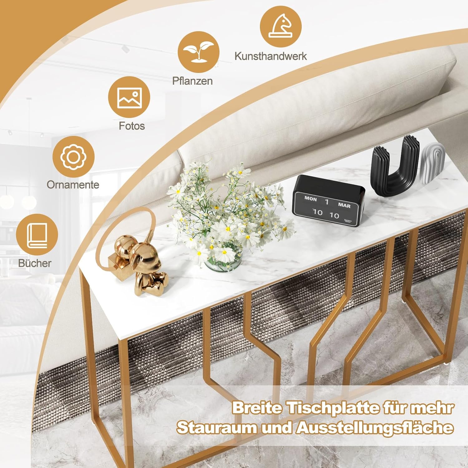 Ongeacht wat je nodig hebt, of het nu opbergruimte of tentoonstellingsruimte is, deze consoletafel is de ideale keuze. De witte marmerimitatie structuur en het geometrische gouden metalen frame stralen een hoogwaardig, elegant gevoel uit. Het brede tafelblad biedt voldoende ruimte voor het bewaren en presenteren van alledaagse voorwerpen en decoratieve voorwerpen. De combinatie van duurzame plank en massieve metalen buizen zorgt voor een betere duurzaamheid, langere levensduur en hogere stabiliteit. Bovendien kan de kantelbeveiliging de ingangstafel veilig vastzetten om omvallen te voorkomen. Al met al is deze stijlvolle consoletafel een perfecte aanvulling voor woonkamer, entree enz.