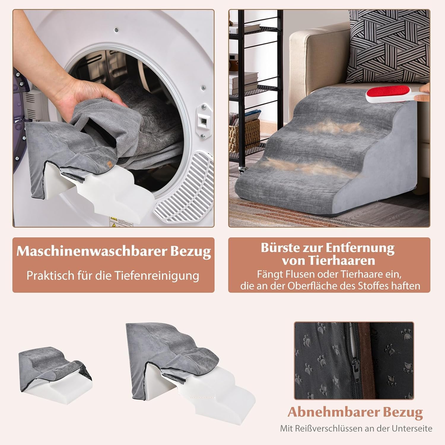 - Eenvoudige reiniging: de huisdiertrap beschikt over een afneembare en machinewasbare hoes, die geschikt is voor een grondige reiniging. En bij de levering is ook een praktische borstel voor dierenharen inbegrepen, waarmee pluisjes of dierenharen die aan het stofoppervlak hechten effectief kunnen worden verwijderd.