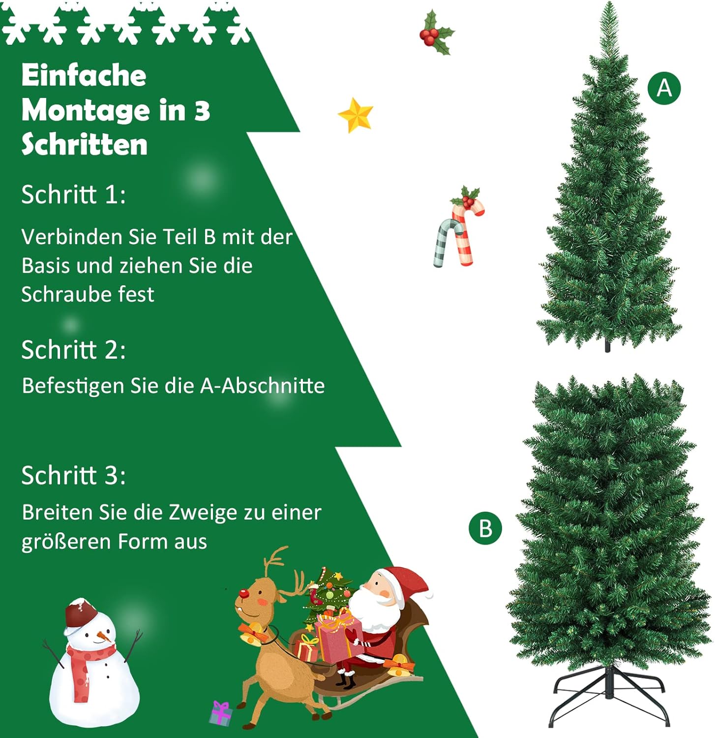 Eenvoudige montage en opslag: met behulp van de meegeleverde, duidelijke en gemakkelijk te begrijpen handleiding (mogelijk niet beschikbaar in het Nederlands) is deze kerstboom, die in 2 delen kan worden gedemonteerd, eenvoudig op te bouwen, te demonteren en op te bergen. Als je hem praktisch hebt opgebouwd, kun je alle takken volledig uitwaaien en zo de boom er nog echt en voller laten uitzien.