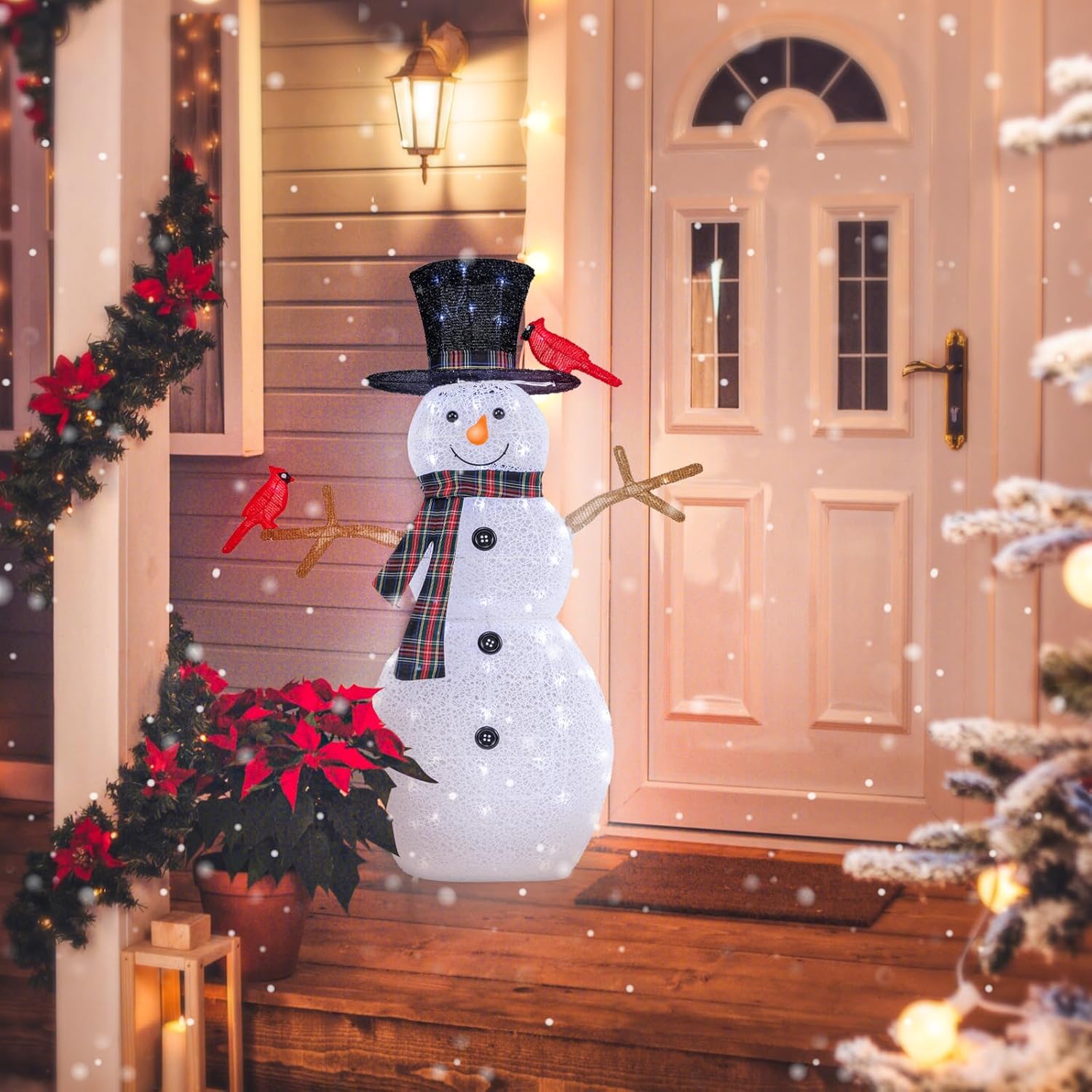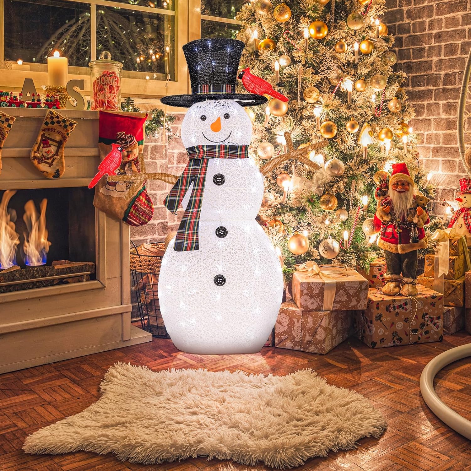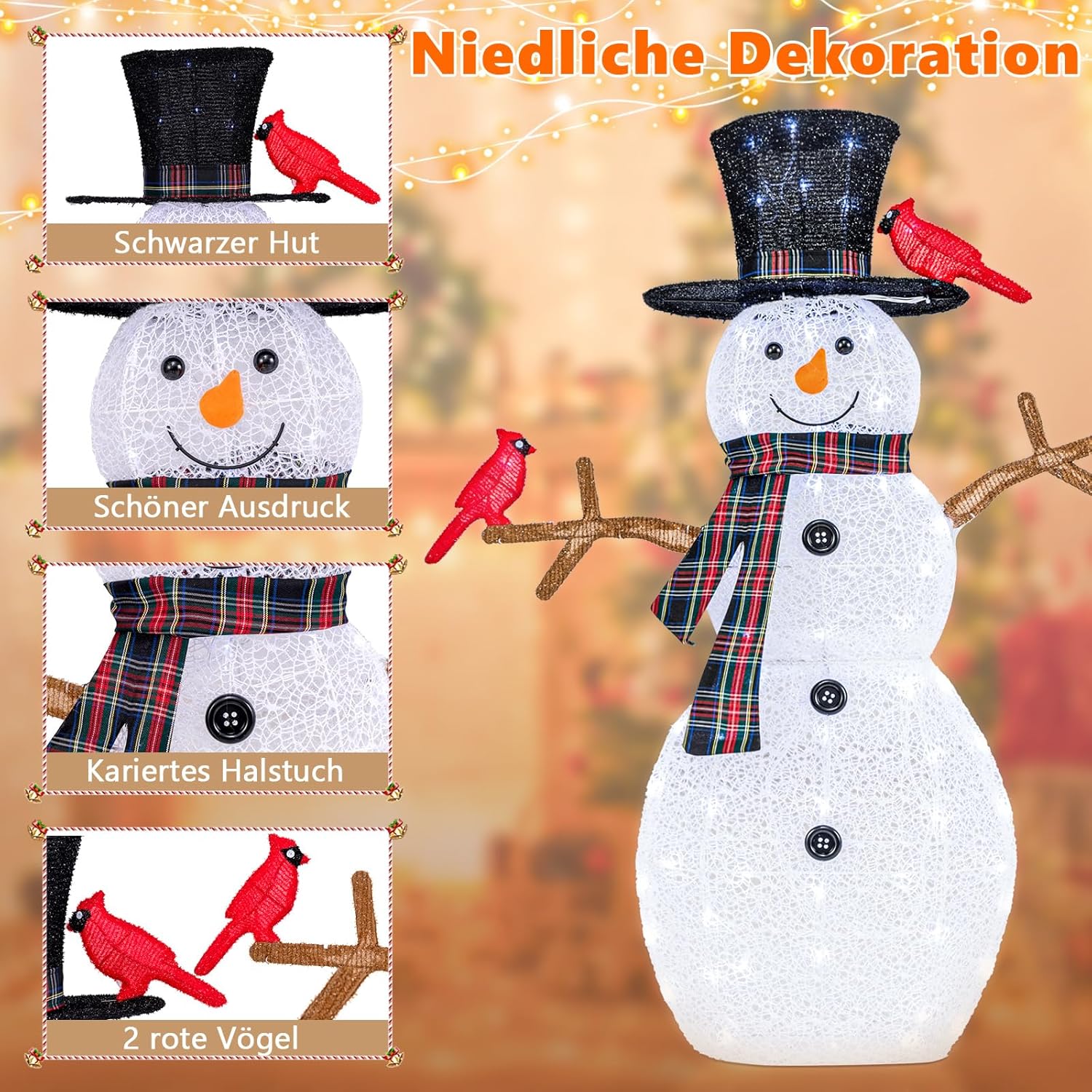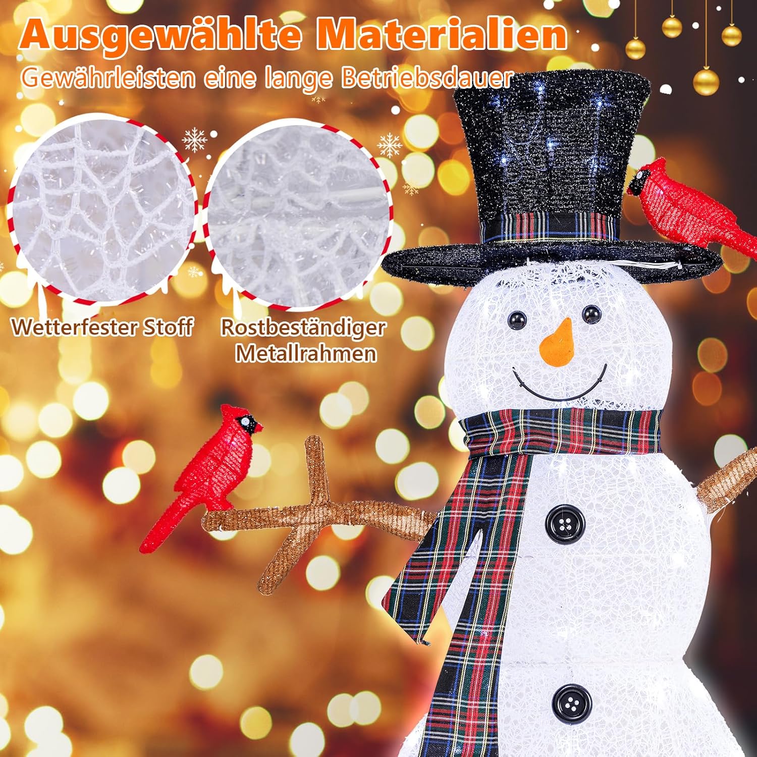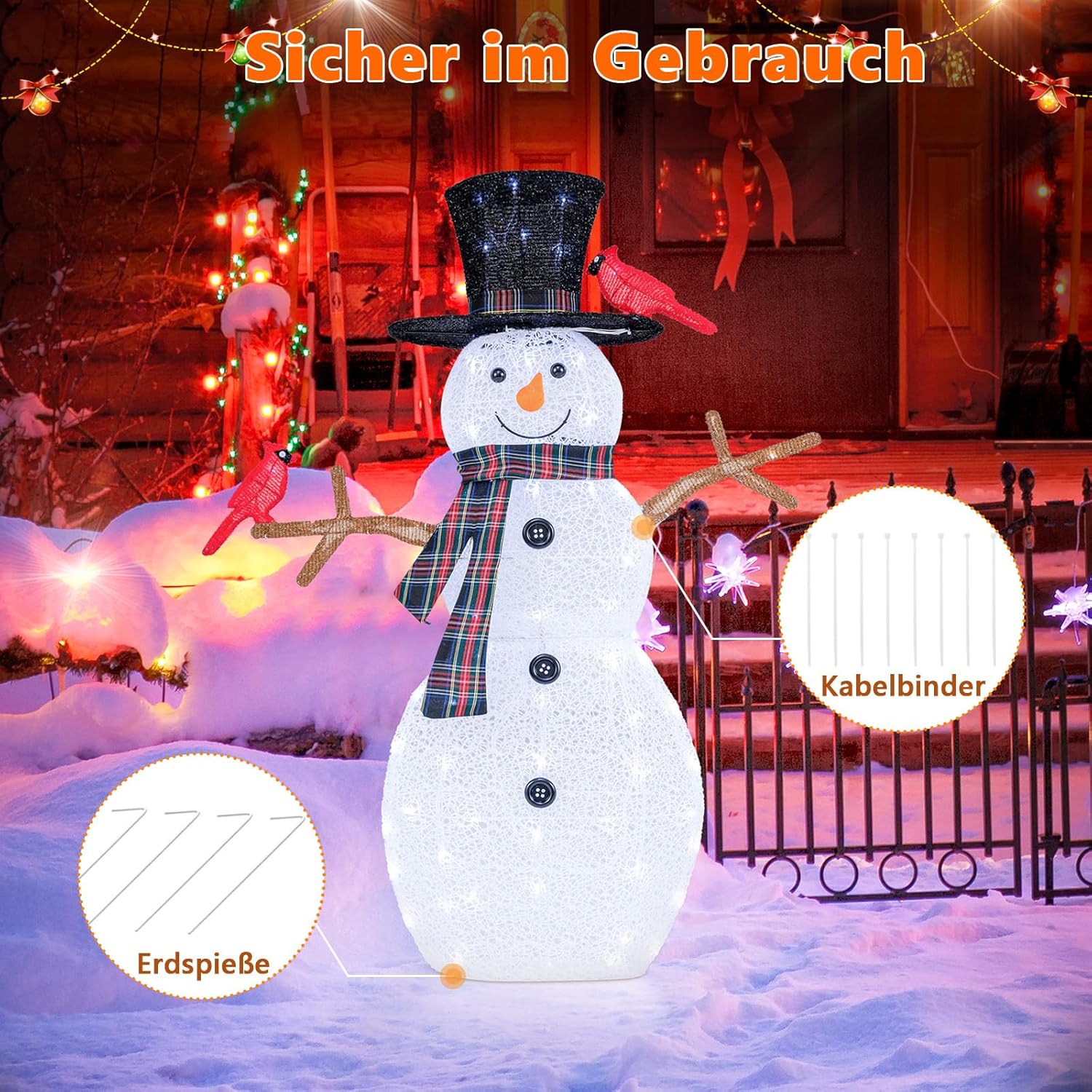 Voeg een vleugje vreugde en feestelijkheid toe aan je kersttijd met deze betoverende kerstdecoratie met verlichte sneeuwpop en rode vogels. Met zijn mooie sneeuwpopdesign, compleet met twee levendige rode vogels, creëert het een grillige en vrolijke sfeer in je woonkamer. Bovendien zijn er 70 koudwitte ledlampen aan de binnenkant, die een adembenemend schouwspel creëren waar je dag en nacht van kunt genieten. Om de stabiliteit nog verder te verhogen, wordt ons ornament met 4 metalen grondpennen bevestigd. Bovendien is de feestelijke tuindecoratie gemaakt van duurzaam lametta-stof en zo ontworpen dat hij bestand is tegen alle weersomstandigheden. Of het nu binnen of buiten wordt geplaatst, deze feestelijke decoratie geeft je bestaande kerstdecoratie een magische touch.