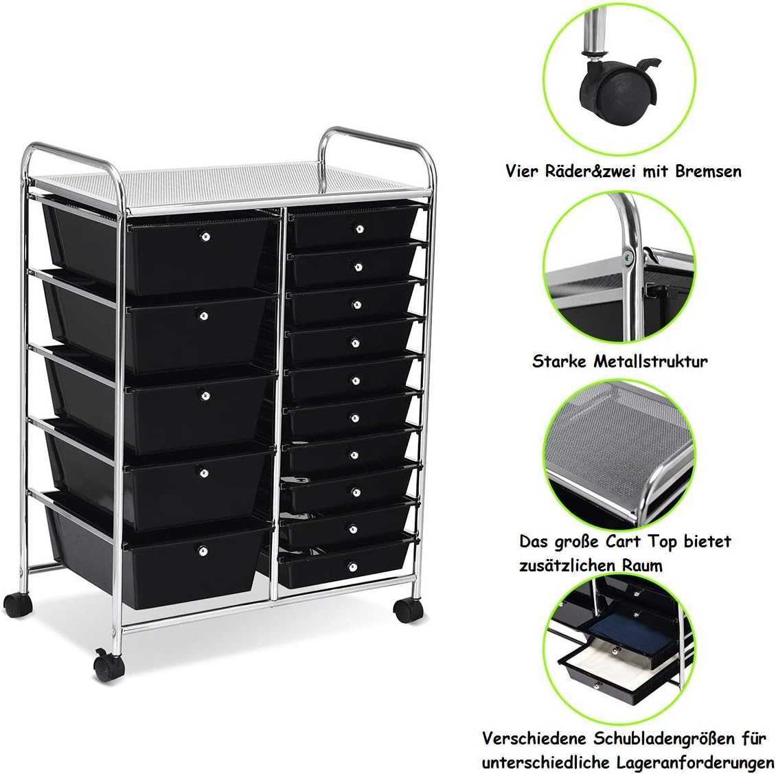 【Uitgebreide toepassingsmogelijkheden】De huishoudwagen beschikt over 5 grote laden en 10 kleine schuifladen, dit maakt hem veelzijdig inzetbaar in de werkkamer, op kantoor, in de badkamer of kinderkamer en hij is geschikt voor cosmetica, borstels, kammen, handdoeken of speelgoed enz.