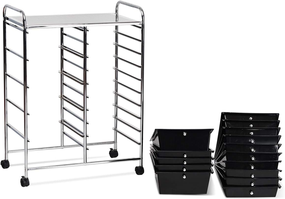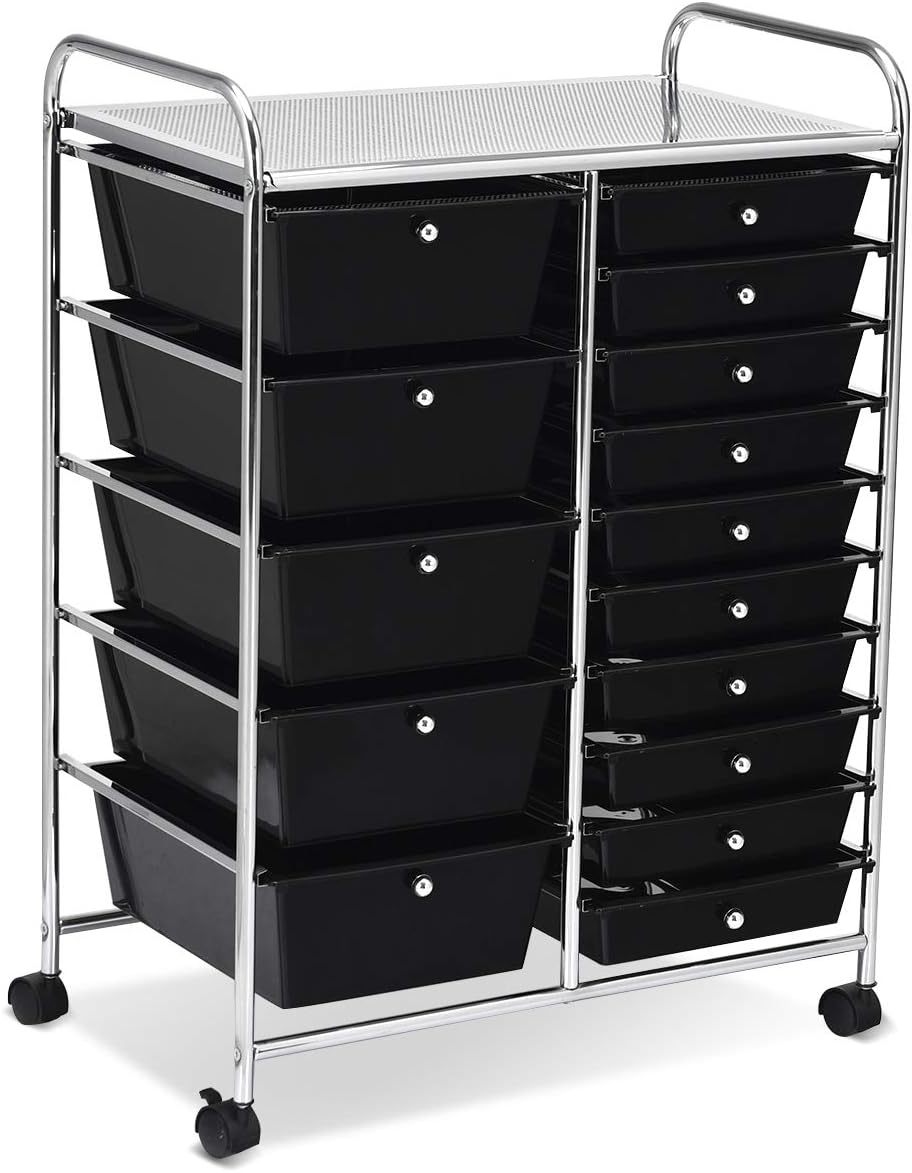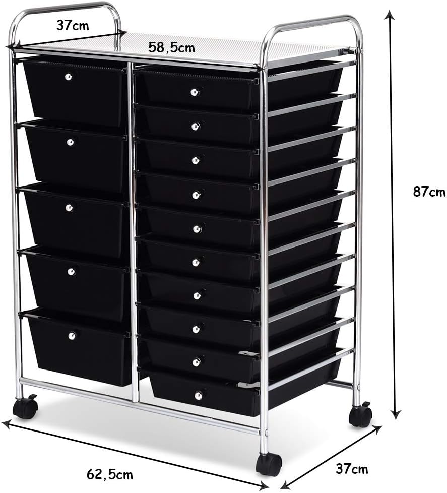 Costway rolwagen, metalen frame, rolcontainer, rolwagen met remmen voor in de badkamer, opbergwagen van plastic, bijzetwagen inclusief 15 stapelbare laden, huishoudelijke kar 62,5 x 37 x 87 cm