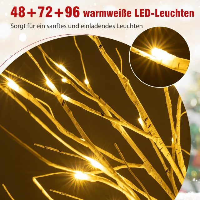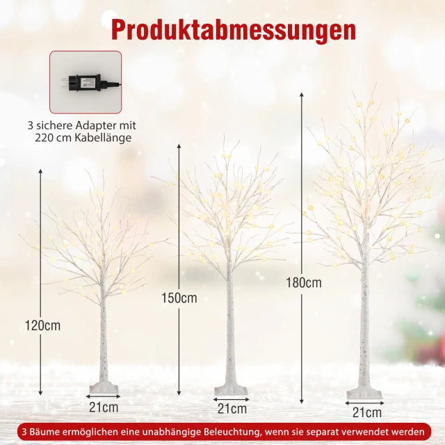 Flexibele 3D-set: Deze decoratieve set bestaat uit verlichte berkenbomen in de maten 120/150/180 cm en biedt flexibele presentatiemogelijkheden, zowel samen als apart. Elke boom heeft een eigen adapter, zodat u ze onafhankelijk van elkaar kunt verlichten en uw ruimte naar wens kunt inrichten.