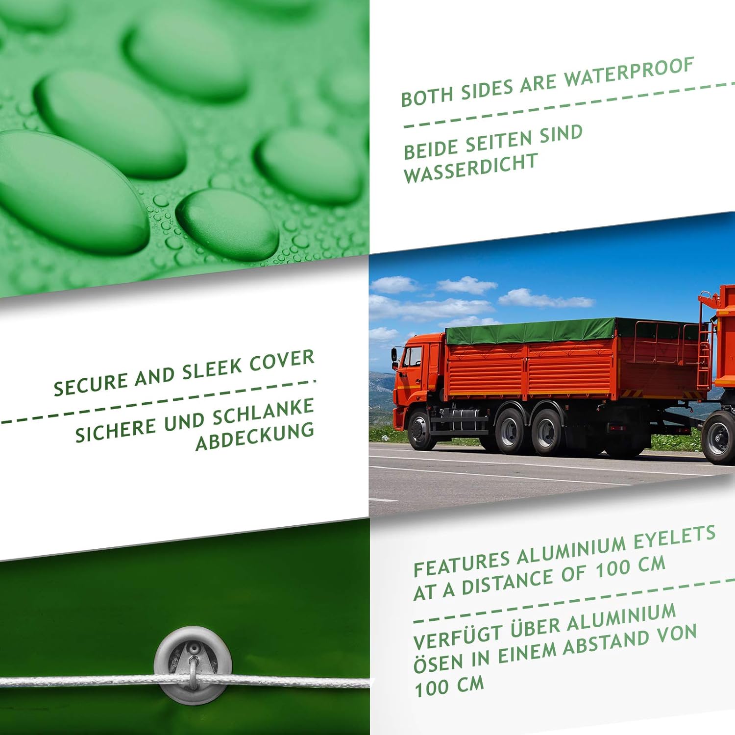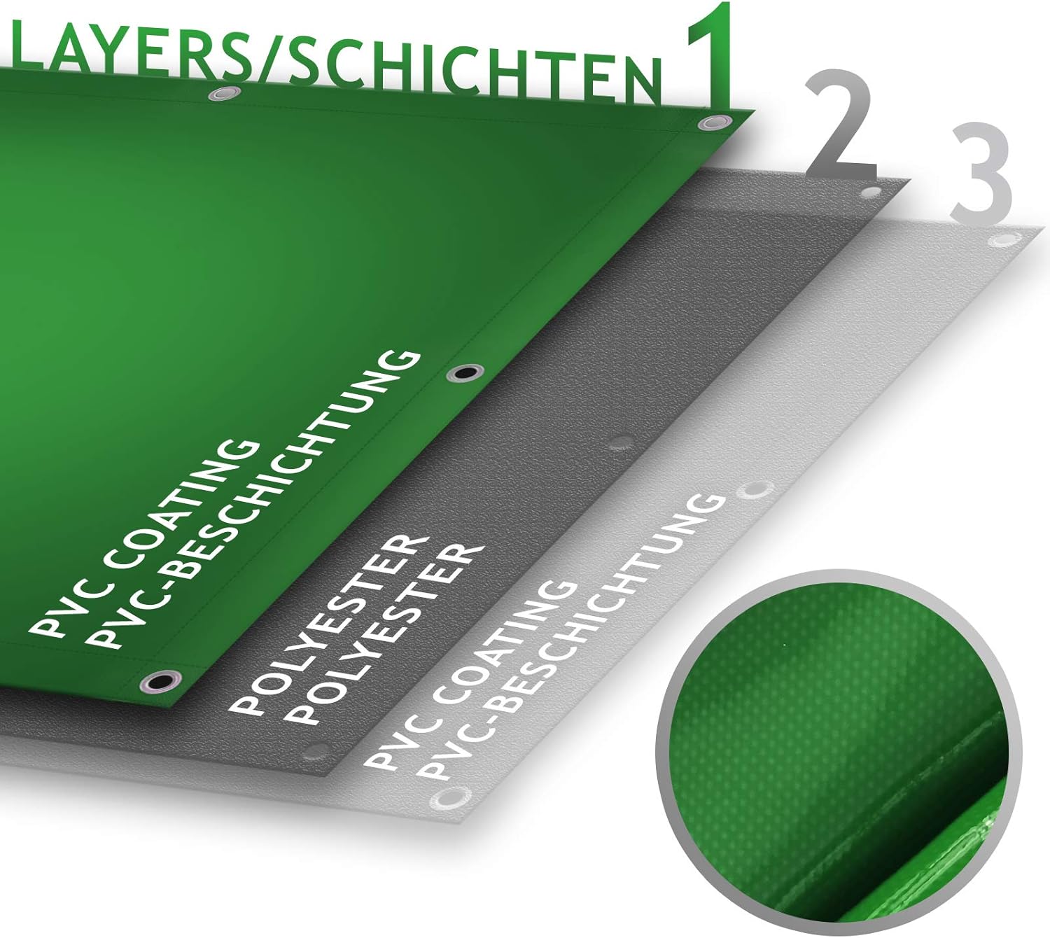 Duurzaam pvc-gecoat polyester, waterdicht, uv-bestendig en temperatuurbestendig. Beschikbare maten: 2 x 3 m, 3 x 5 m, 3 x 6 m, 4 x 3 m, 4 x 5 m, 4 x 6 m, 4 x 7 m, 4 x 8 m, 5 x 6 m, 5 x 7 m, 5 x 8 m. Beschikbare kleuren: blauw/groen/grijs/zwart/wit/antraciet