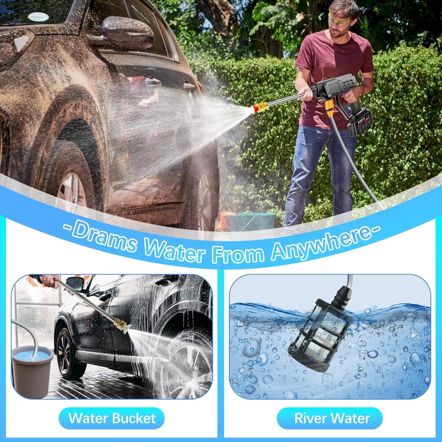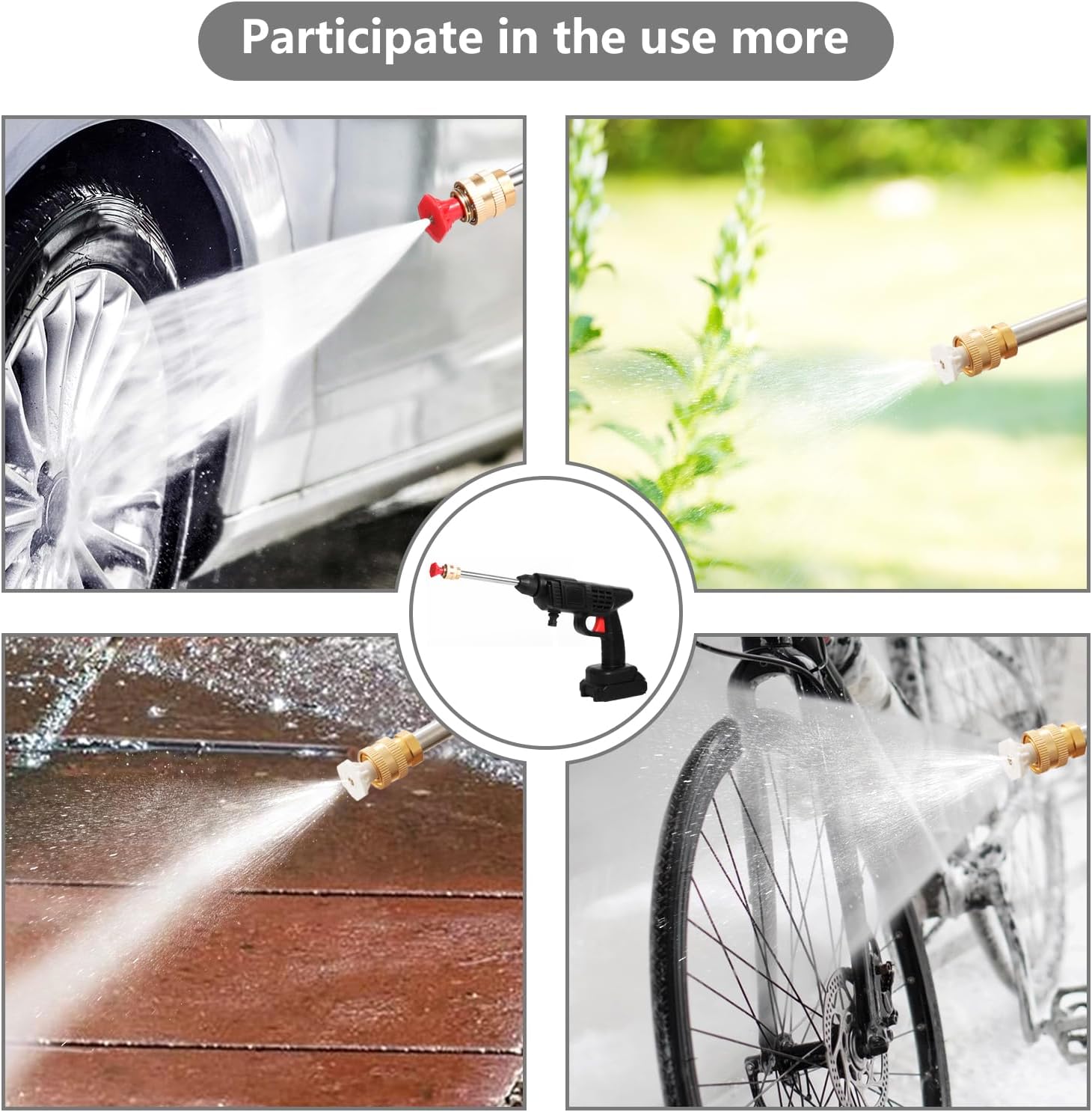【Vermogensfuncties】: Draadloze hogedrukreiniger Uitgerust met een 18D-zuigerpomp met een zuigerdiameter van 18 mm, heeft het een uitstekend drukeffect en een uitstekende energieopslagcapaciteit. Het hoge drukbereik kan 10 meter bereiken en de maximale waterdruk kan 30 bar bereiken. Het verwijdert gemakkelijk hardnekkige vlekken en reinigt hoeken en andere moeilijk bereikbare plaatsen.