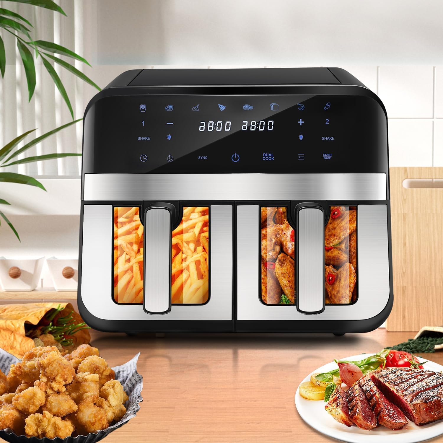 - Onafhankelijk koken met twee zones: 9 liter heteluchtfriteuse met extreem grote capaciteit en twee zones bestaat uit twee onafhankelijke 4,5 liter frituurmanden, die afzonderlijk of tegelijkertijd kunnen worden gebruikt om een verscheidenheid aan ingrediënten flexibel te koken.