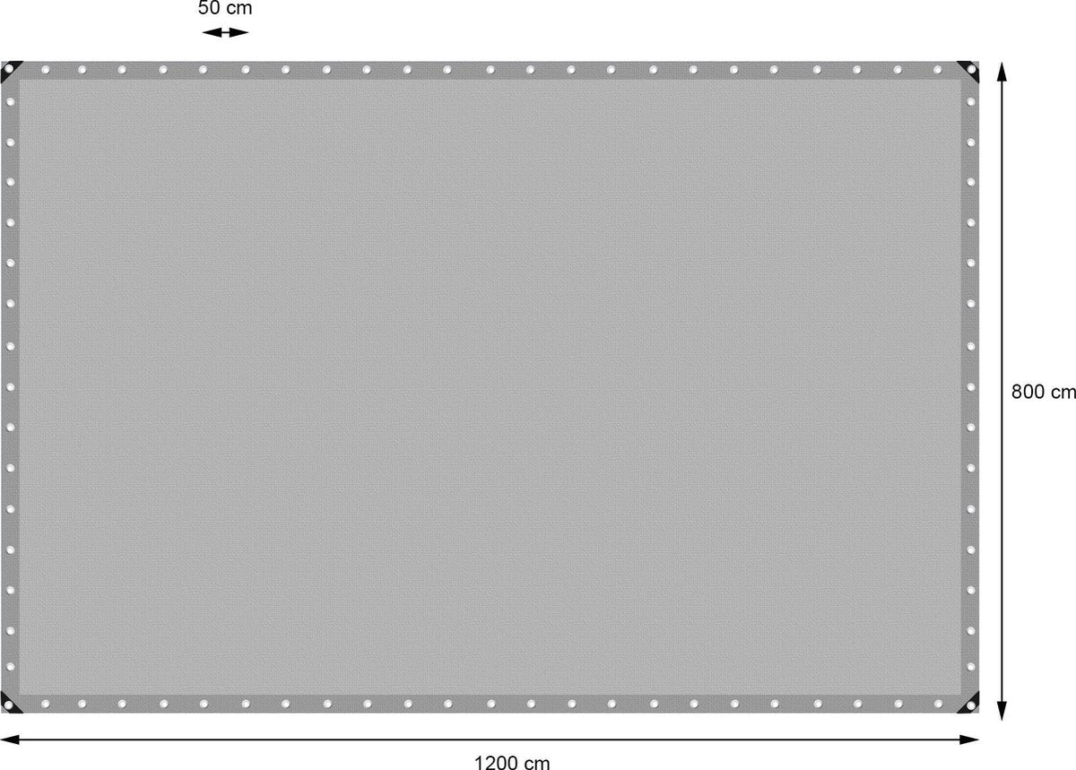 Technische gegevens: Materiaal: Hoogwaardig polyethyleenweefsel met aan beide zijden een polyethyleencoating Kleur: grijs Afmetingen: 8 x 12 m Gewicht: 260 g m² Materiaal ogen: Roestvrij aluminium