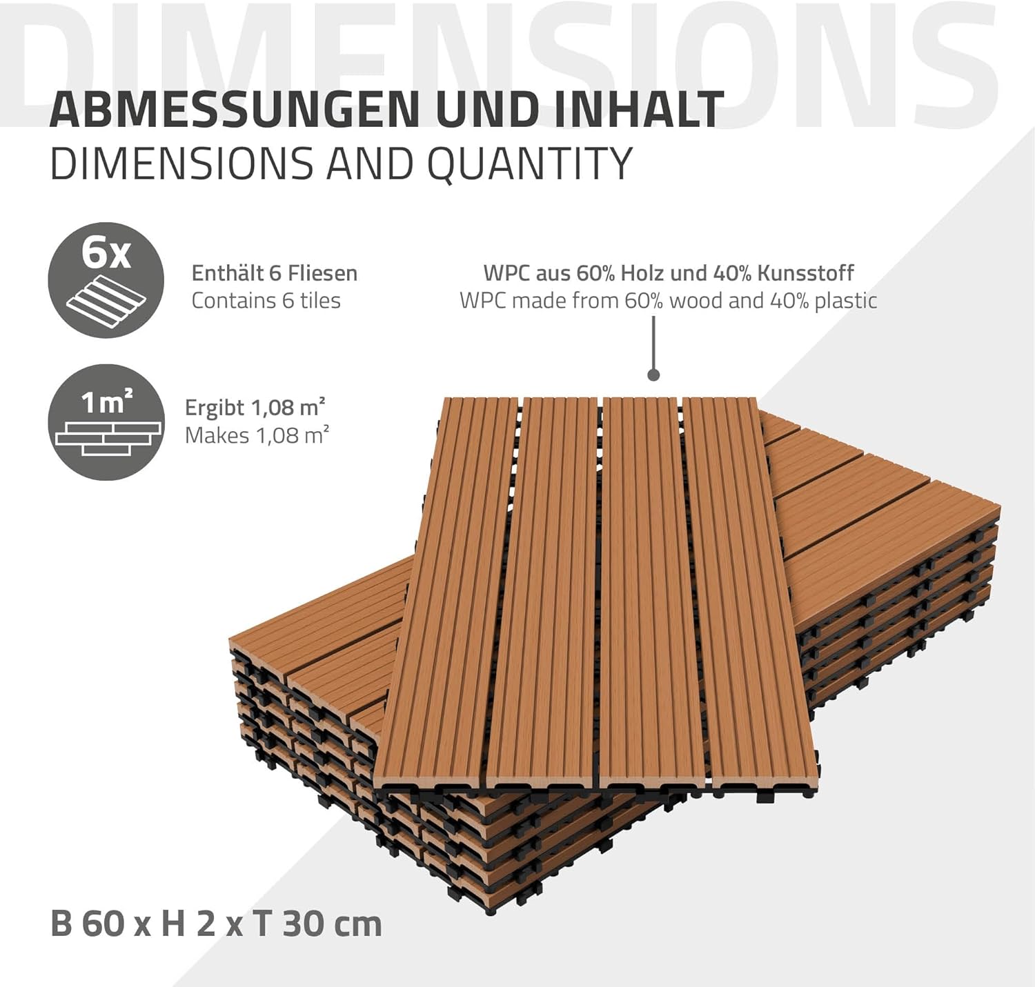Robuust, duurzaam materiaal: de terrastegels bestaan uit hoogwaardig WPC-materiaal en zijn daarom zeer weerbestendig. Bovendien zijn ze antislip, splinteren en scheuren ze niet. Het WPC is een thermoplastisch composietmateriaal en bestaat uit hout, kunststof en additieven. De combinatie van deze materialen zorgt voor een hoge weerstand en optische eigenschappen van een natuurproduct.
