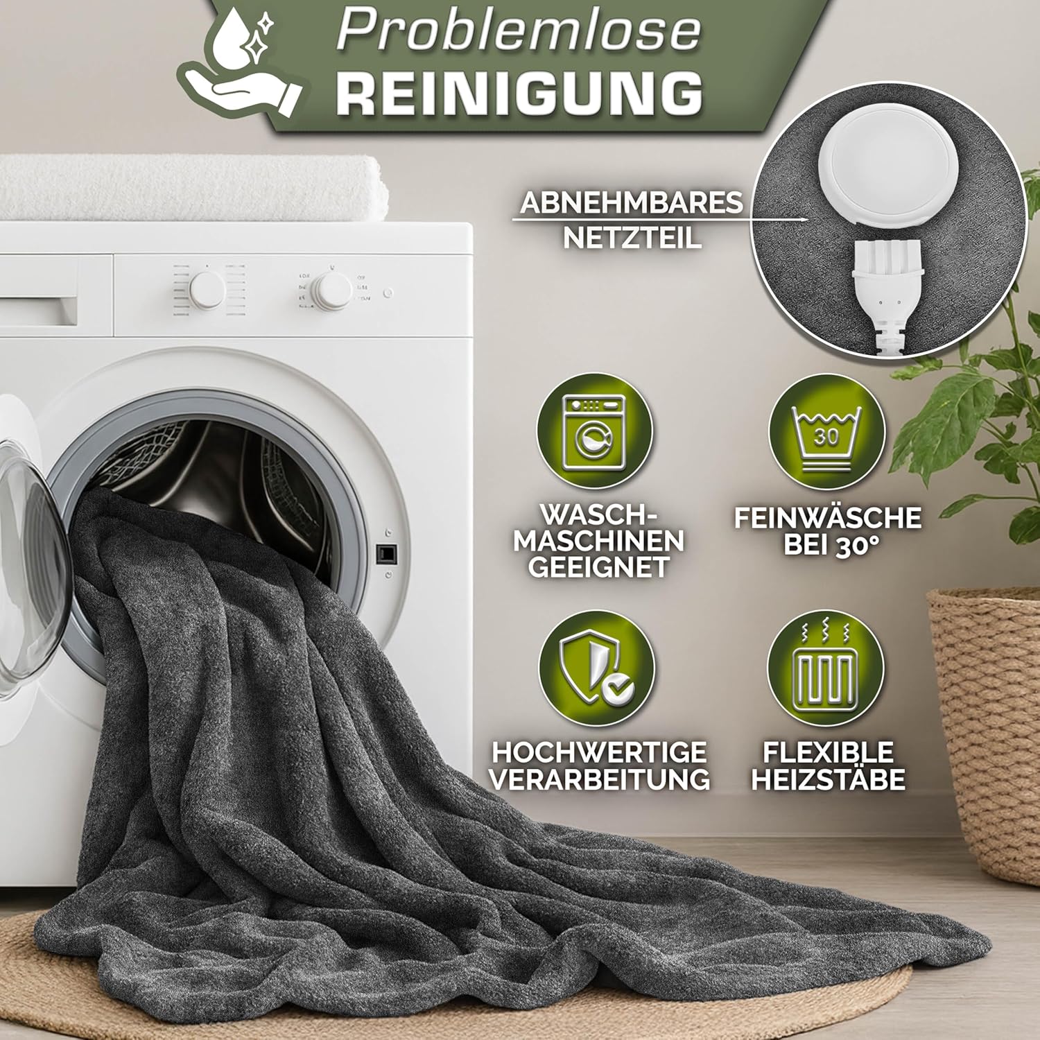 Vermogen: 100 W. Gemaakt van behaaglijk flanel, fleece en vliesstof, ademend, wasbaar tot 30 °C, afneembare controller, kabellengte ca. 2,30 meter