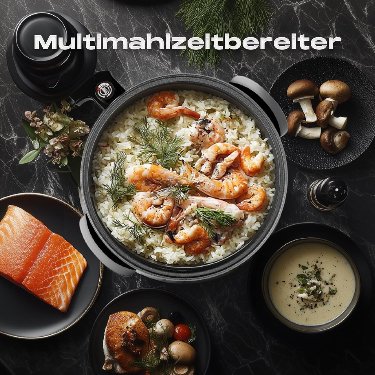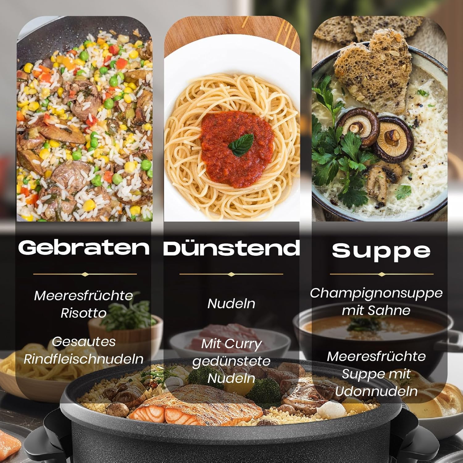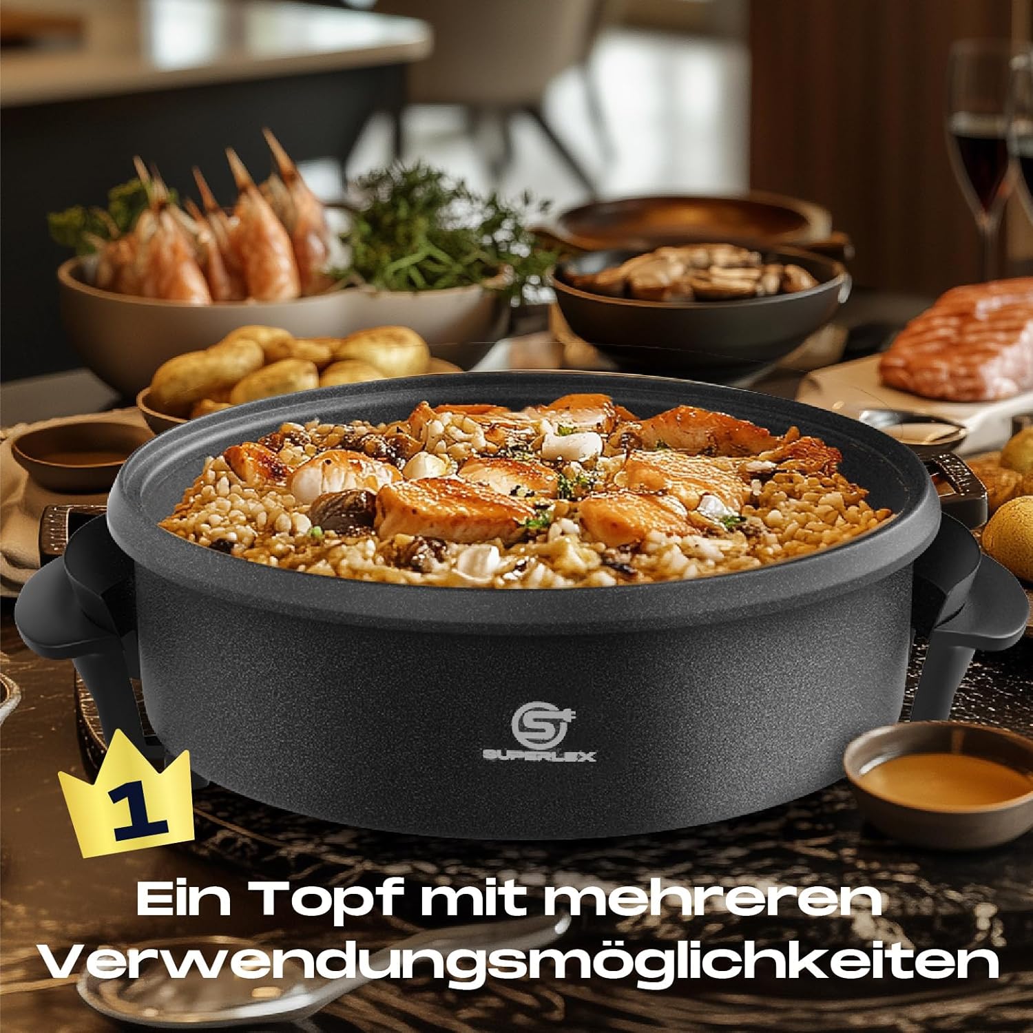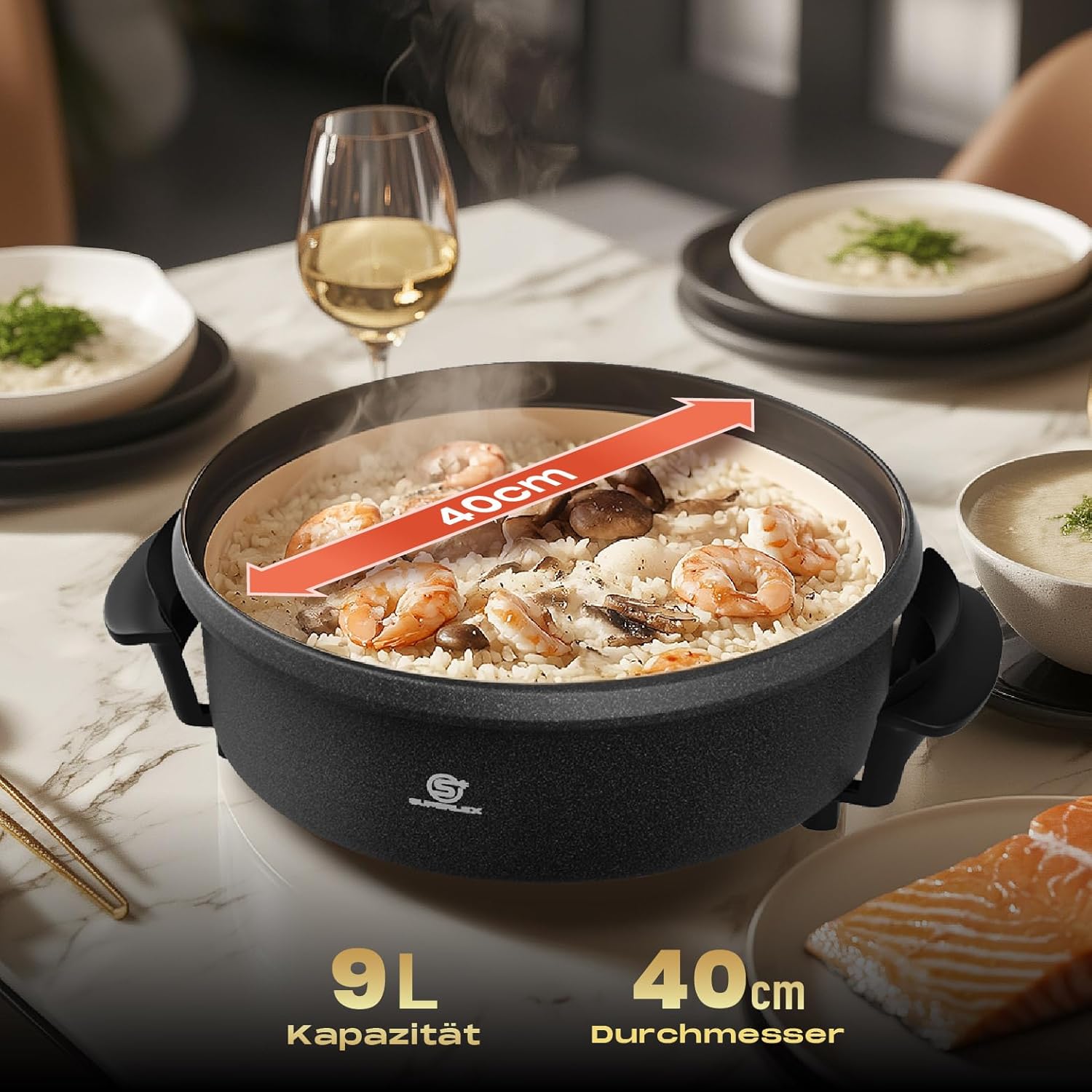 Krachtige werking van 1500 W en XL-formaat: ideaal voor feestjes of camping: braden, koken en warm houden op 40 cm binnenoppervlak (7 cm diepte) met gelijkmatige warmte door aluminium plaat + stalen bodem.
