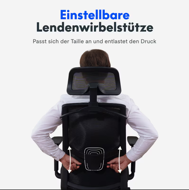 De bureaustoel is uitgerust met een ademende mesh-rugleuning die optimale ventilatie biedt, waardoor je koel en comfortabel blijft – zelfs tijdens lange werkdagen. De geïntegreerde lendensteun zorgt voor een natuurlijke zithouding en voorkomt rugklachten.