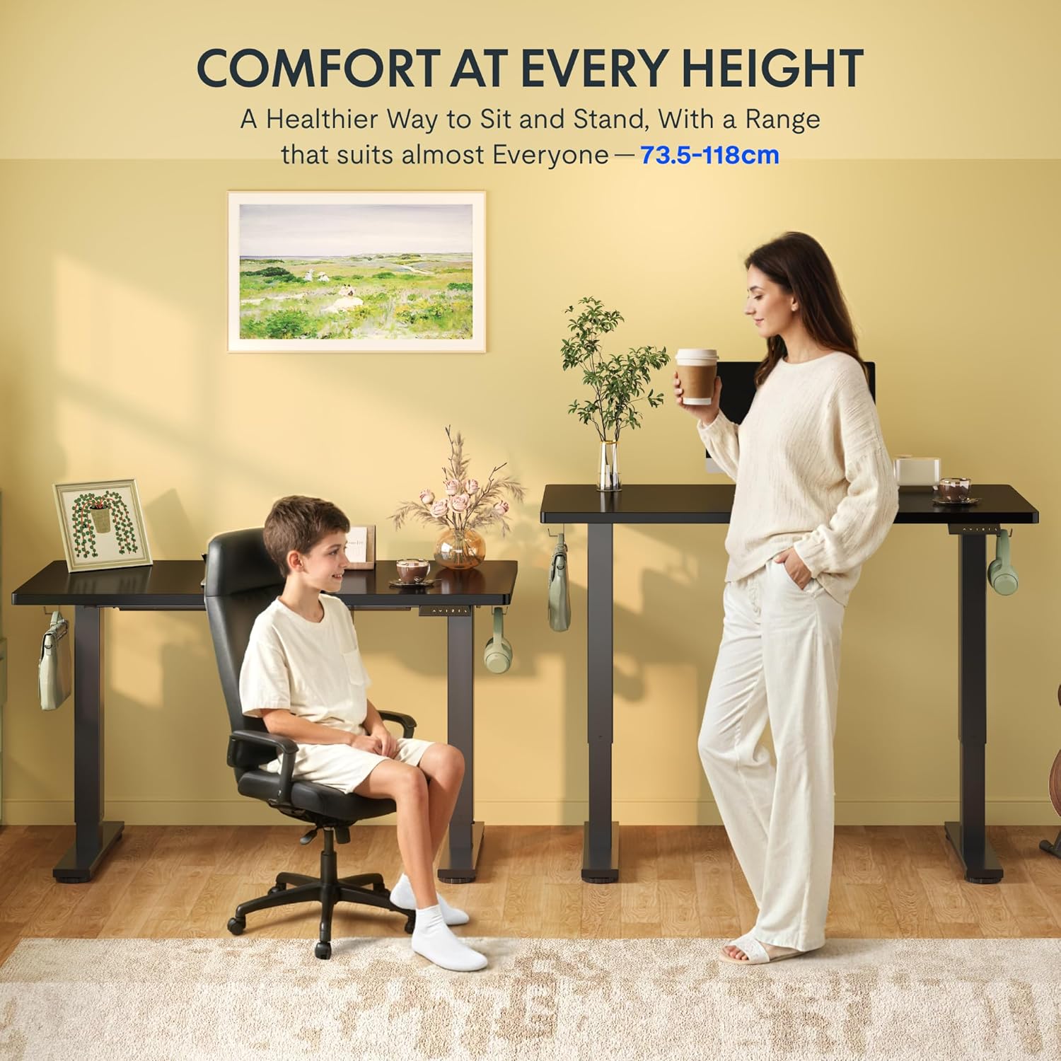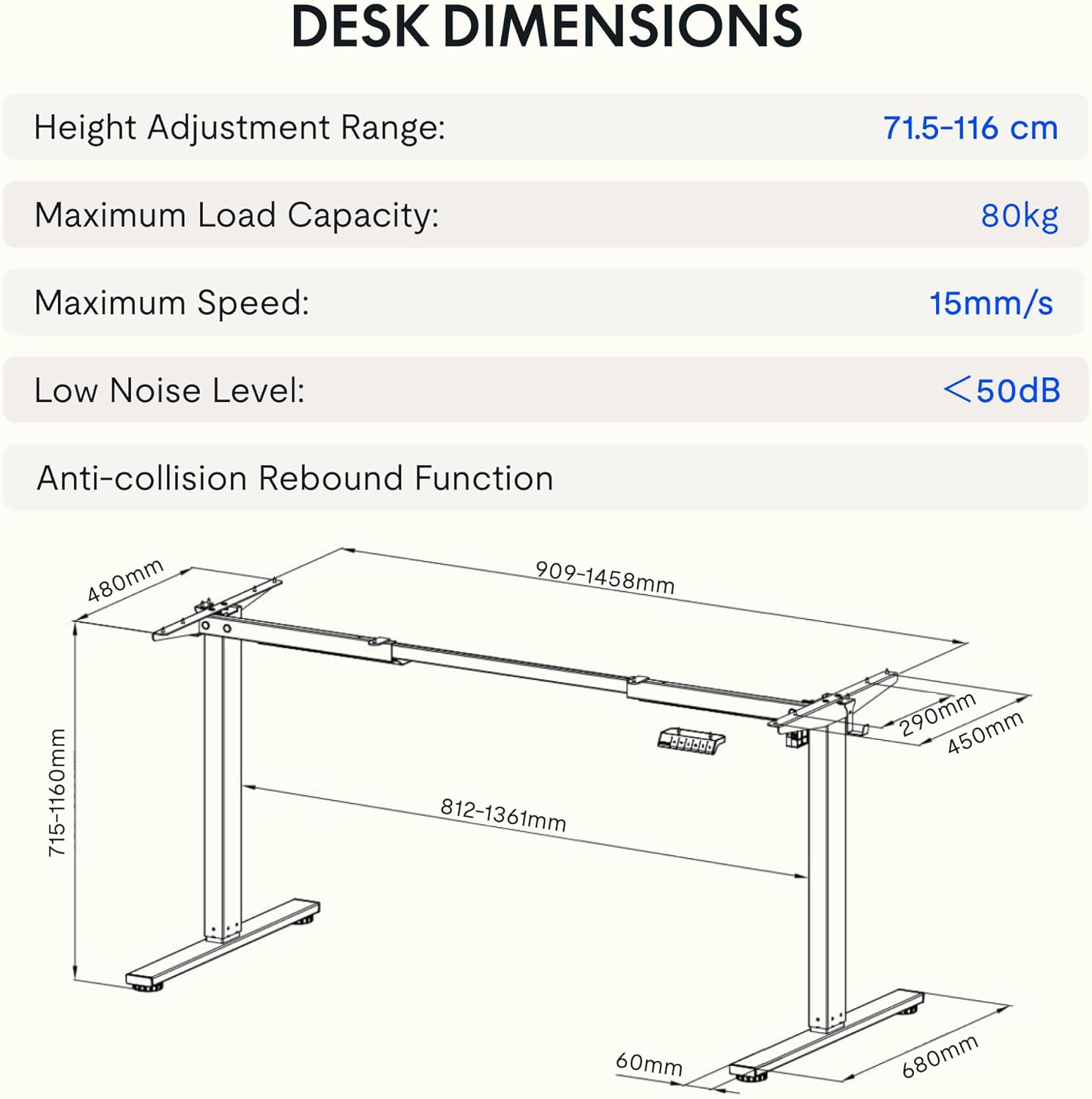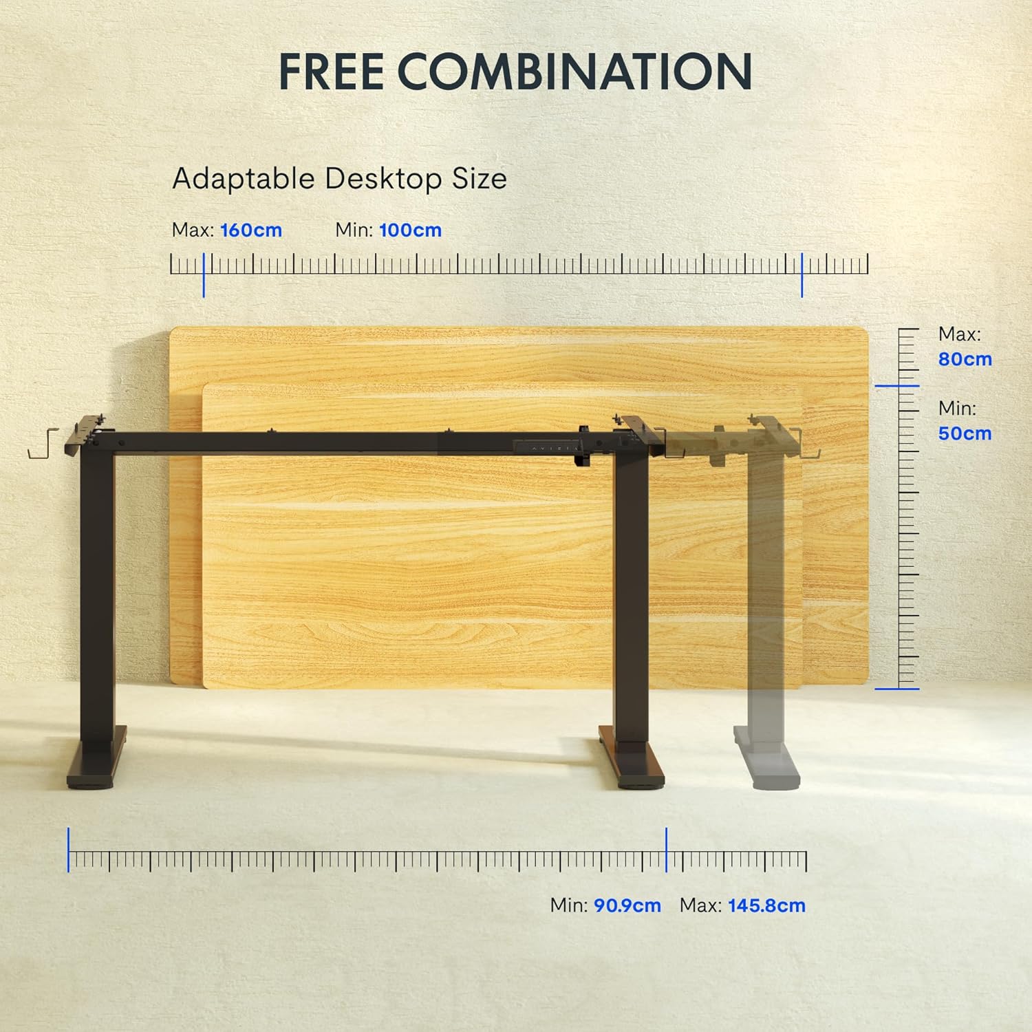 In hoogte verstelbaar: de hoogte van de tafel is verstelbaar van 72 cm tot 116,5 cm, geschikt voor mensen van alle lengtes. De uitbreidbare framebreedte is aanpasbaar aan verschillende bureaugroottes (lengte 100-160 cm, breedte 50-80 cm), biedt voldoende ruimte voor computermonitoren, toetsenborden, laptops en andere kantooraccessoires en verbetert de werkefficiëntie.