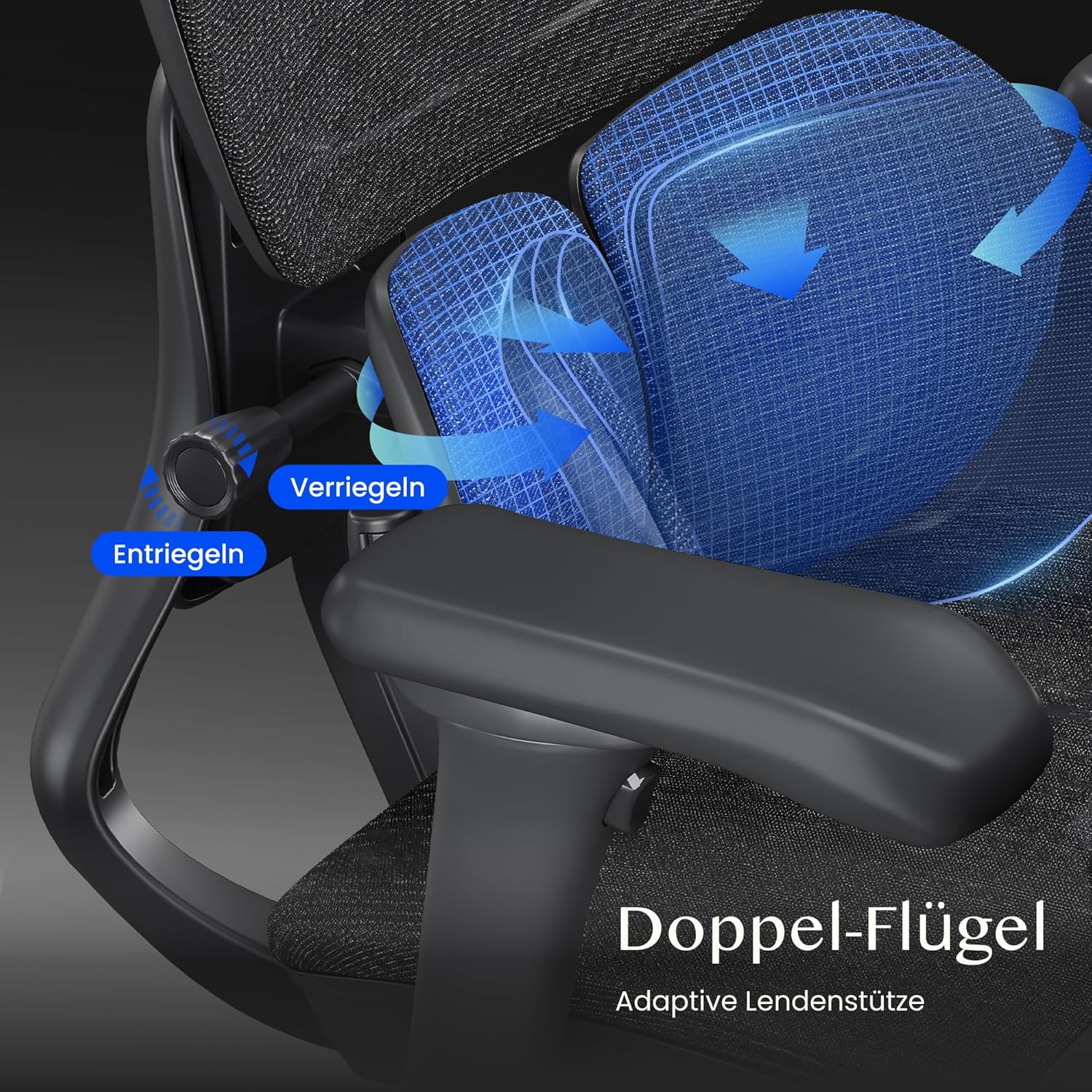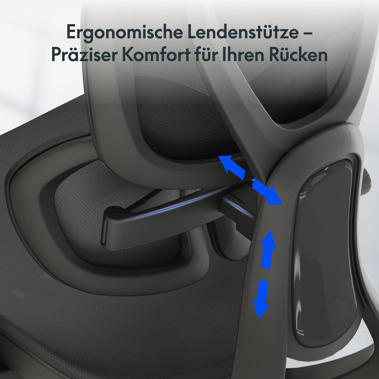 De bureaustoel is uitgerust met een ademende mesh-rugleuning die optimale ventilatie biedt, waardoor je koel en comfortabel blijft – zelfs tijdens lange werkdagen. De geïntegreerde lendensteun zorgt voor een natuurlijke zithouding en voorkomt rugklachten.