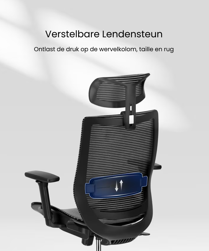 De bureaustoel is uitgerust met een ademende mesh-rugleuning die optimale ventilatie biedt, waardoor je koel en comfortabel blijft – zelfs tijdens lange werkdagen. De geïntegreerde lendensteun zorgt voor een natuurlijke zithouding en voorkomt rugklachten.
