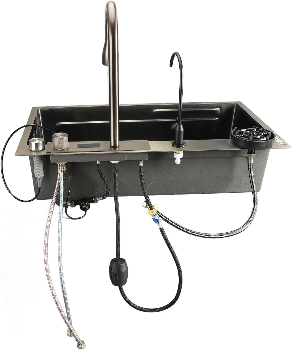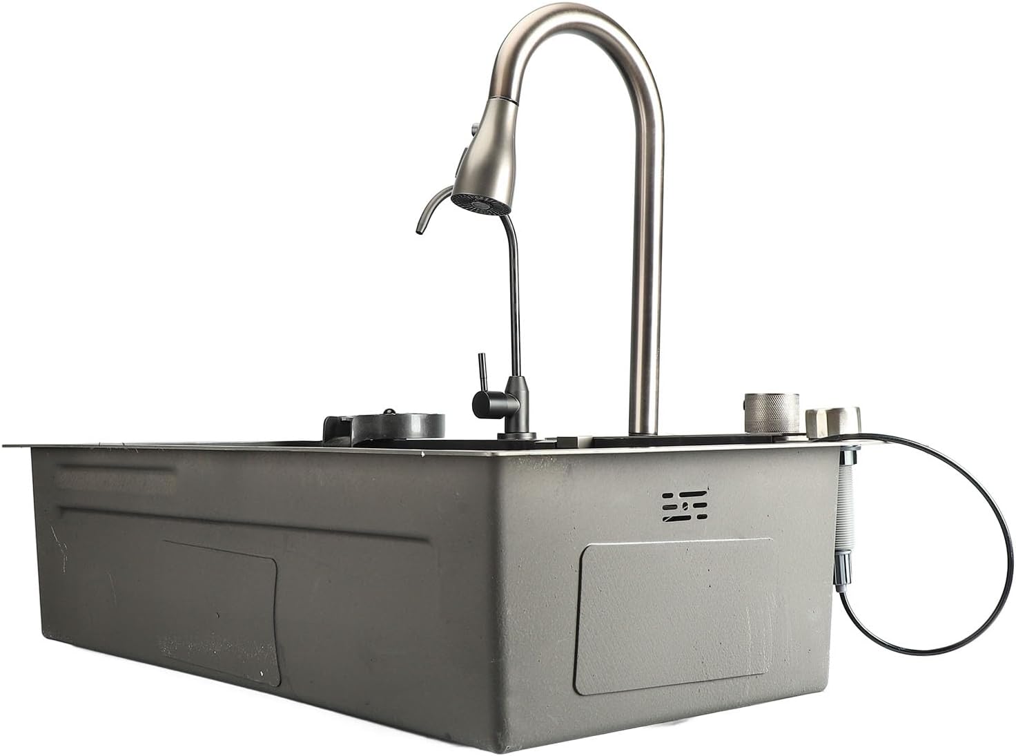 Strak, modern design: deze onderbouwspoelbak is uitgerust met een uittrekbare kraan, een digitaal display voor het bijhouden van de watertemperatuur en het waterverbruik, en een aparte drinkkraan voor extra gemak. De kleur voegt een stijlvolle touch toe en creëert een leuke en moderne sfeer in uw keuken. Hij heeft geen elektriciteit nodig en biedt een naadloze en comfortabele gebruikerservaring.