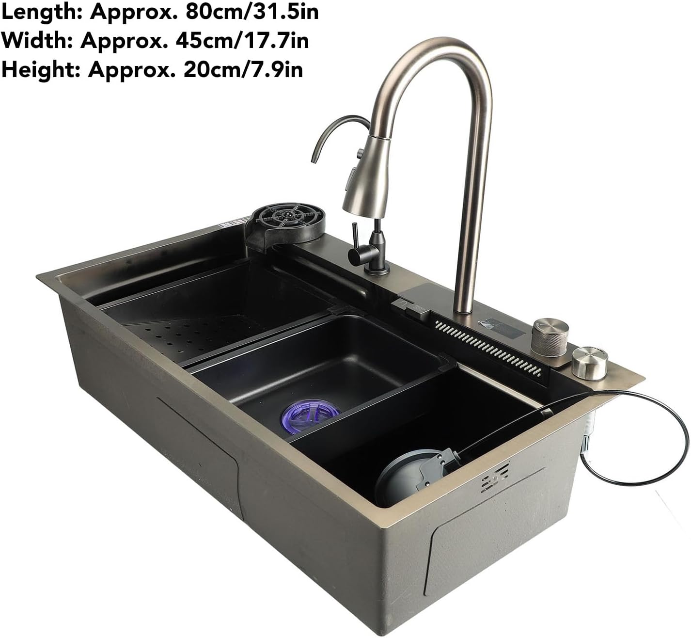 【Ontwerp met grote capaciteit】Deze roestvrijstalen spoelbak is 80 x 45 cm / 31,5 x 17,7 inch groot en biedt voldoende ruimte om gemakkelijk grote potten, pannen en keukengerei af te wassen, ideaal voor drukke keukens. Het verstelbare watervalsysteem zorgt voor een brede, zachte waterstroom, ideaal voor het afspoelen van groenten, fruit en vaat zonder spetters, voor een efficiënte reiniging.