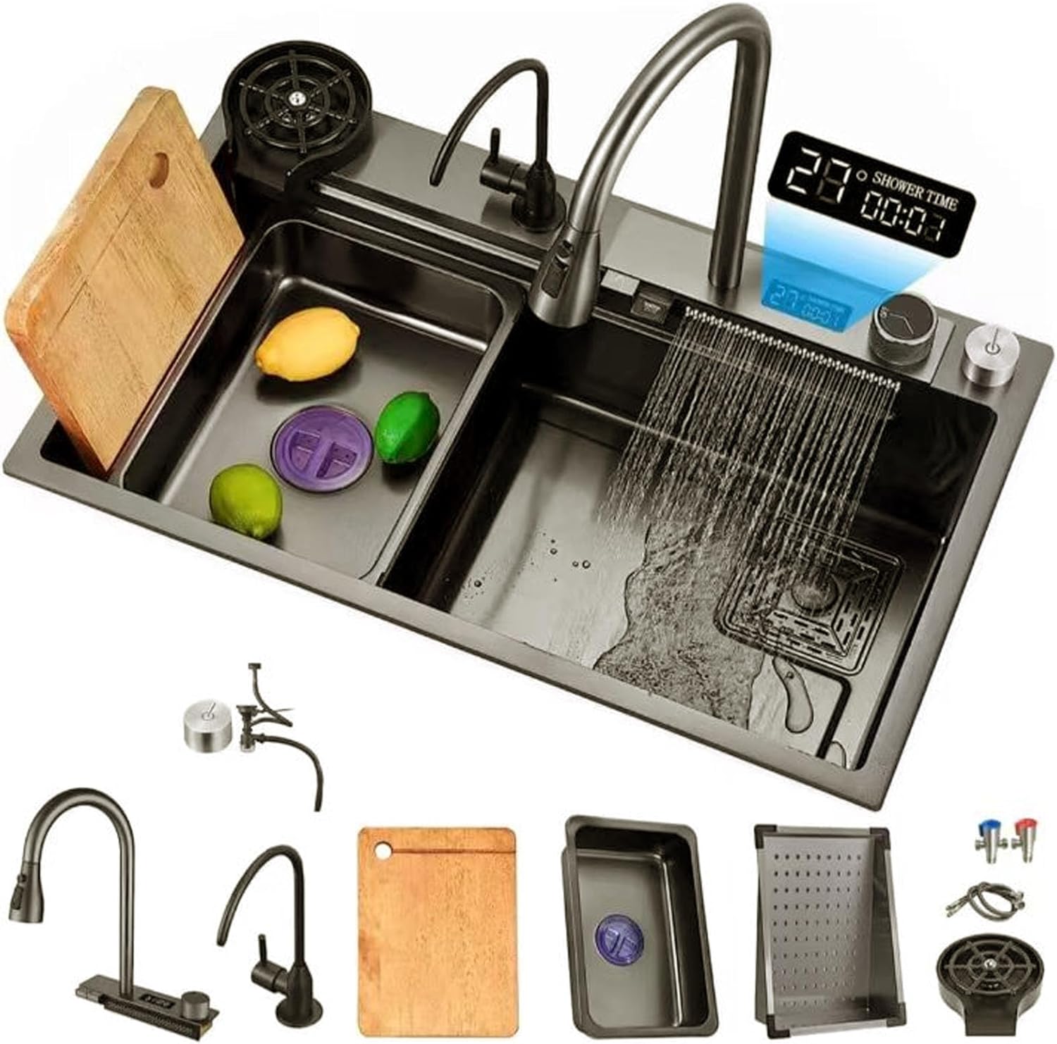 5. Veelgebruikte scenario's: De dubbele spoelbak met digitaal display kan multifunctioneel worden gebruikt, voor het wassen van groenten, afwassen, schoonmaken en andere gezinsscenario's.