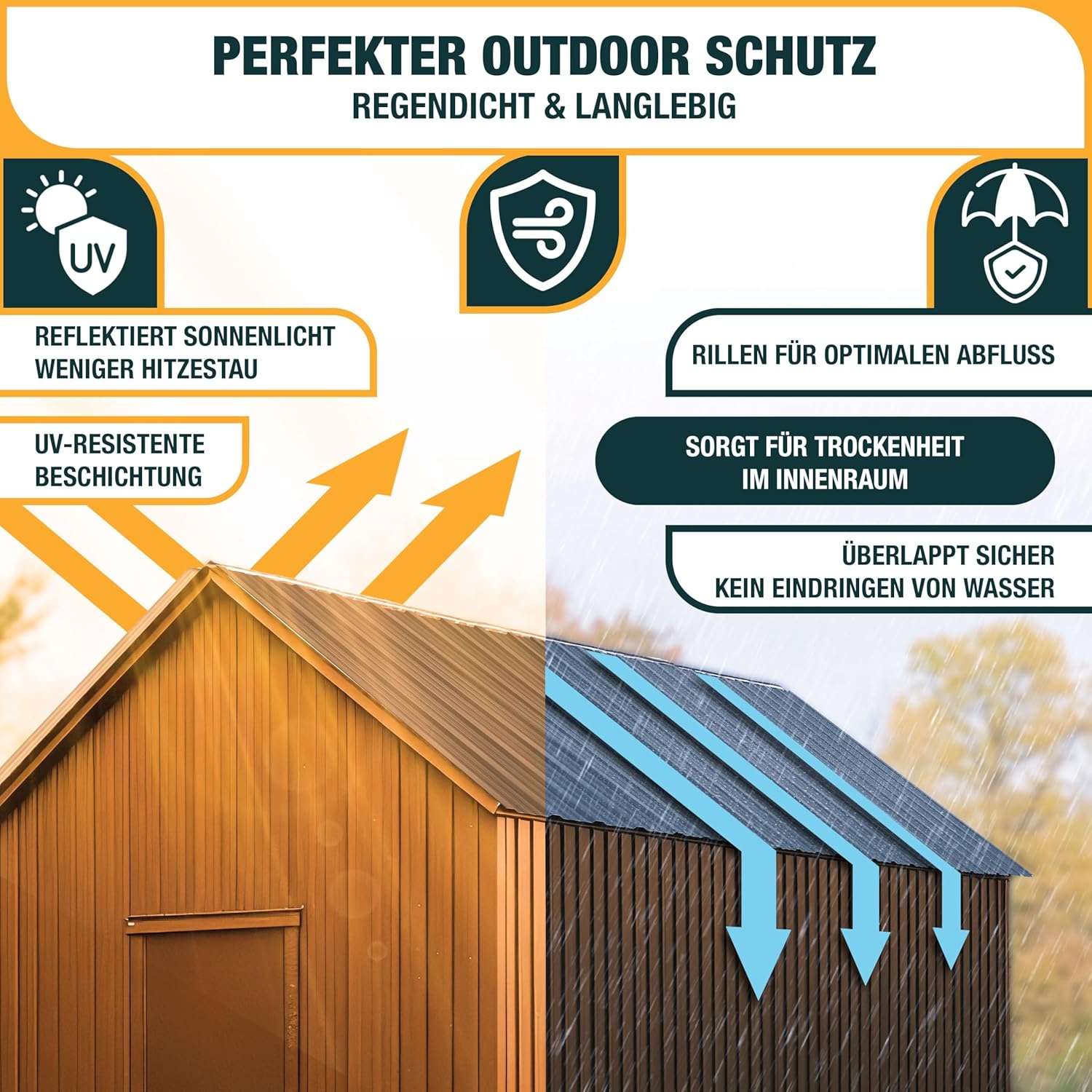 • Weerbestendig: de dakpanelen beschermen je bezittingen tegen weer en wind. De groeven dienen voor bescherming tegen water, zodat het water bij regen optimaal en gelijkmatig kan weglopen. Dankzij de vorm wordt ook voorkomen dat er tussen de afzonderlijke platen geen water binnendringt en zich daar kan ophopen.