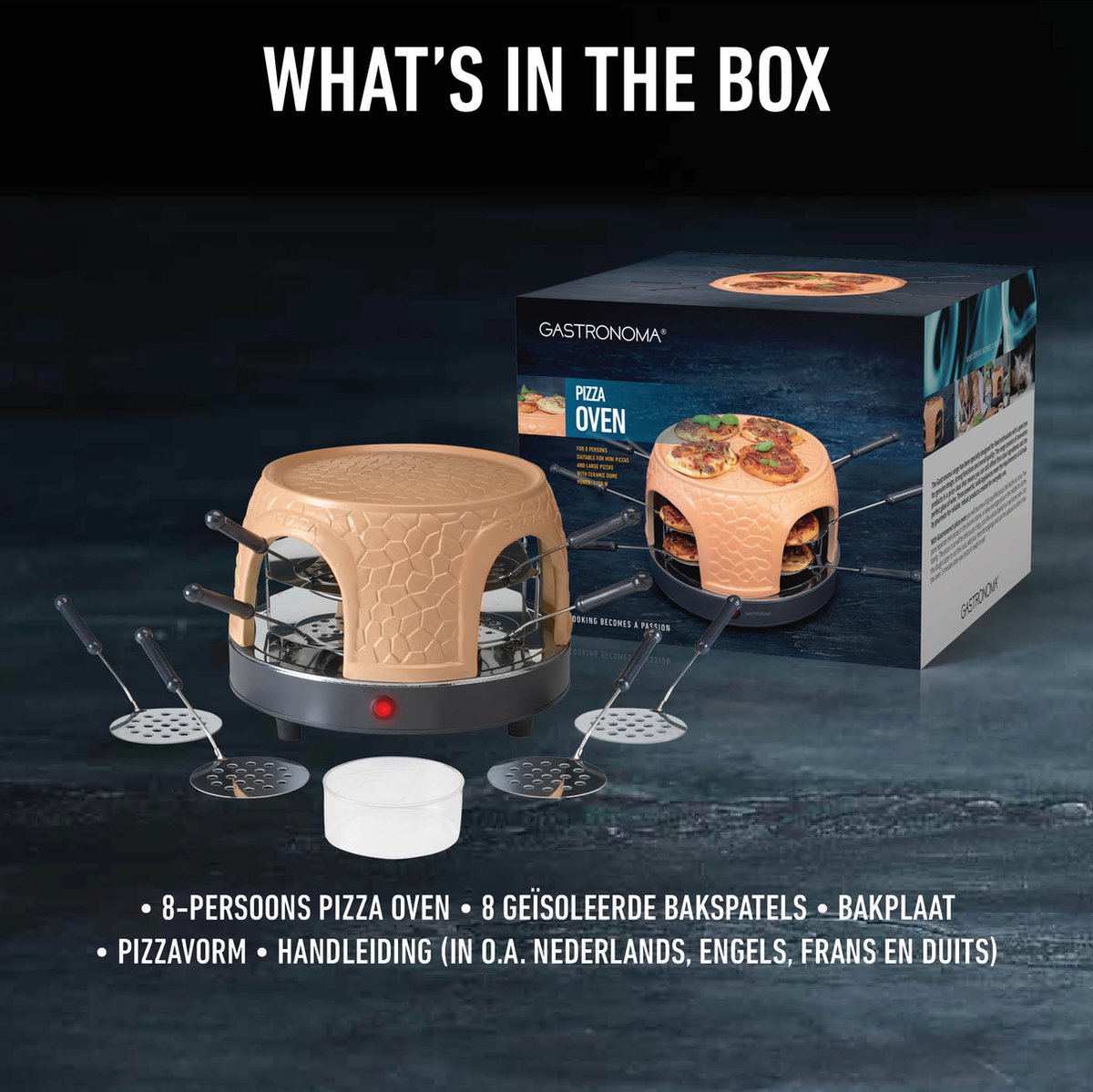 Uitgekeken op gourmetten en fonduen? Binnen de funcooking wereld is er in de afgelopen jaren een geweldig nieuw fenomeen ontstaan: pizzagourmetten. Niets verslaat namelijk de magie van een authentieke pizza-ervaring. Een Gastronoma pizza oven op je keukentafel brengt niet alleen de Italiaanse keuken binnen handbereik, maar opent ook de deur naar een wereld van culinaire creativiteit en sociale saamhorigheid. De Gastronoma 18310018 is een pizza oven waarmee 8 personen tegelijk vanaf de keukentafel de authentieke smaak en textuur van knapperige korst, smeltende kaas en perfect gegaarde toppings kunnen creëren. De pizza oven is, naast het maken van mini pizza's, tevens geschikt voor het maken van één grote pizza. De Gastronoma 18310018 wordt geleverd met alles wat je nodig hebt: acht geïsoleerde bakspatels, een handige bakplaat en een pizzavorm.