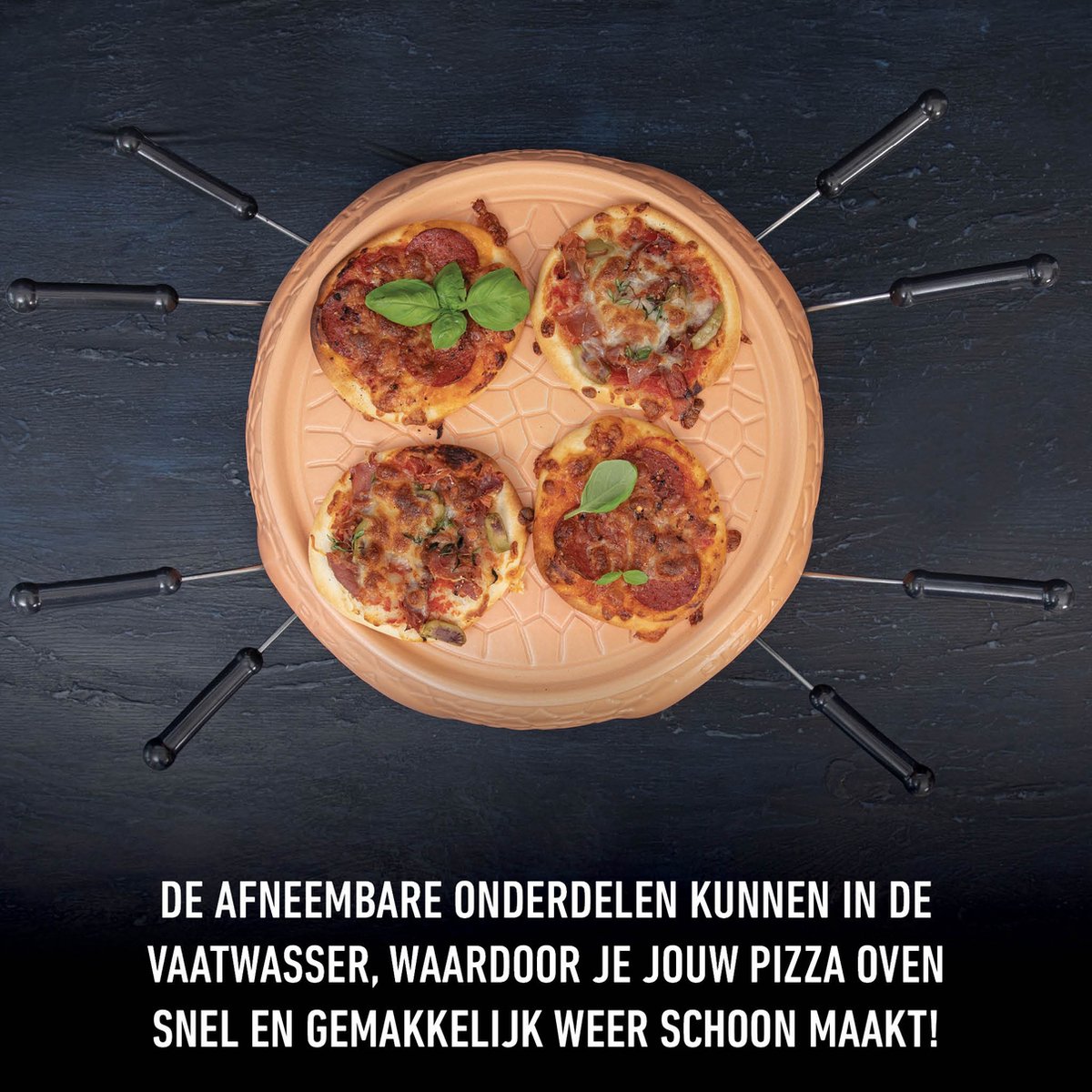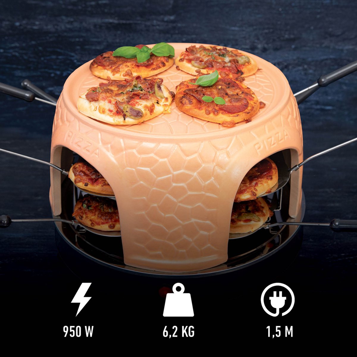 De pizza oven is ontworpen voor gebruiksgemak en plezier. Plaats kleine pizzadeegbodems op de individuele bakspatels, beleg ze met jouw favoriete ingrediënten en schuif ze onder de keramische koepel. Met een wattage van 950 is je eigen, zelfgemaakte pizza klaar in slechts enkele minuten.