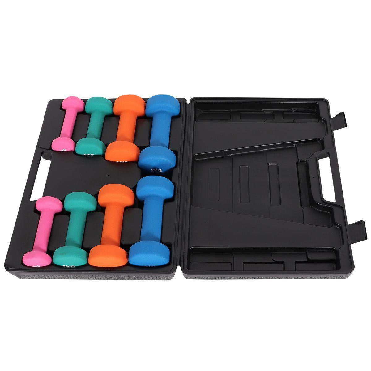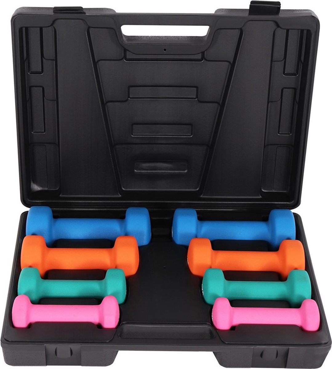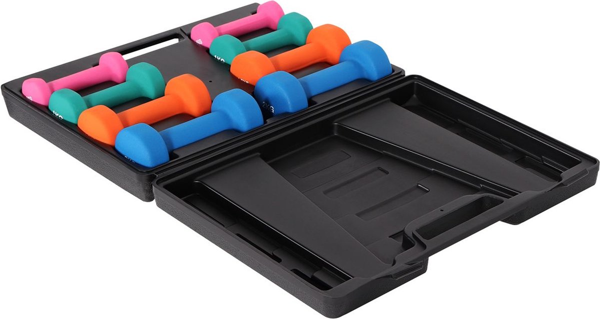 Waarom kiezen voor de Aerobics Set 10 kg? Complete set: 8 gymnastiekhalters in vier gewichtsklassen (0,5 - 2 kg).