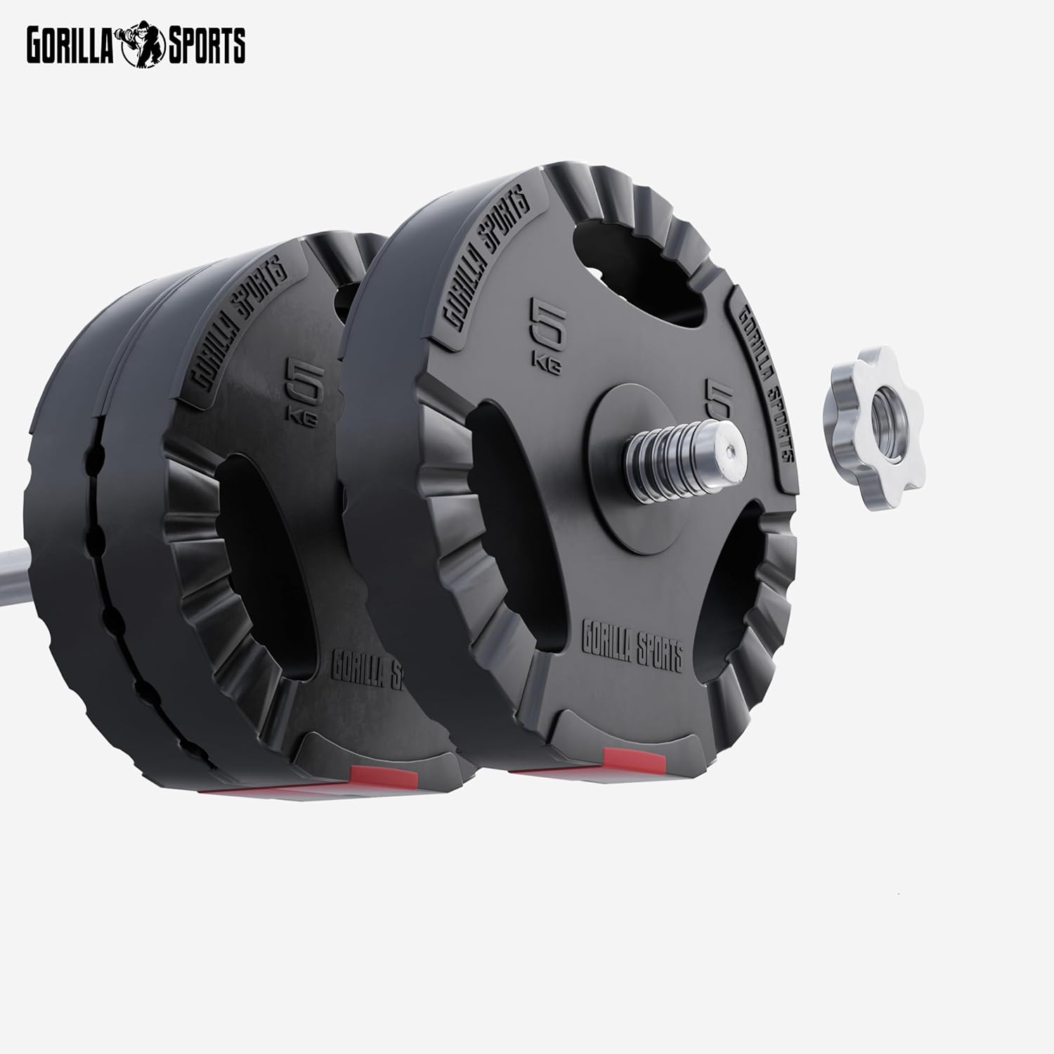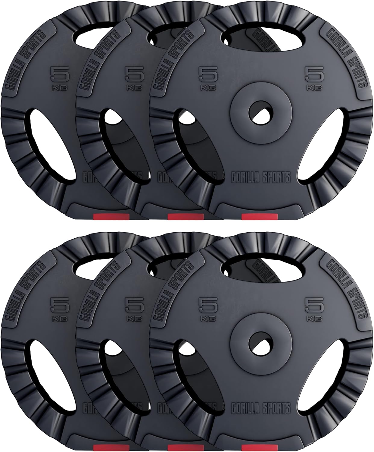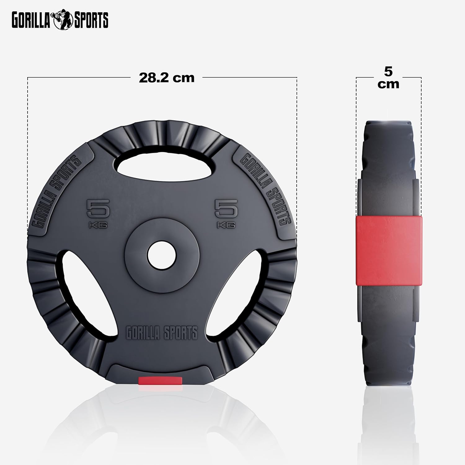 Gorilla Sports kunststof halterschijf: heeft 3 ergonomische grepen en is verkrijgbaar in 5 verschillende gewichtsuitvoeringen - perfect voor een fitnessworkout, met of zonder halterstang.