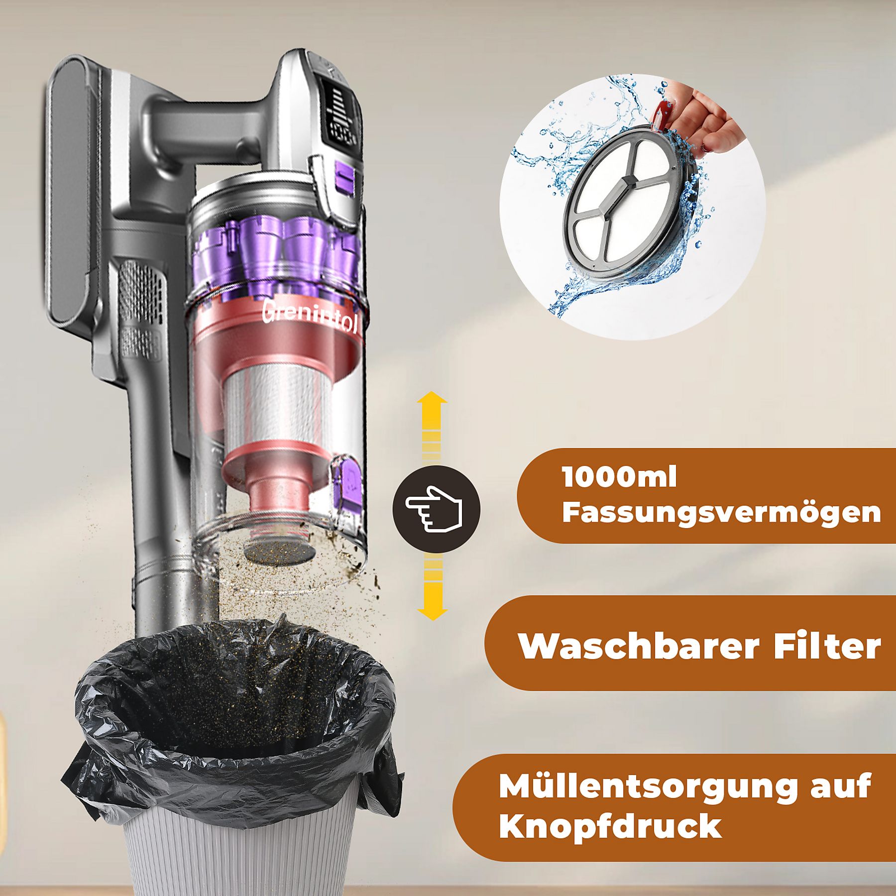 Dankzij de automatische zuigkrachtregeling past de Grenintol draadloze stofzuiger zich intelligent aan de stof- en vuilconcentratie aan voor optimale reinigingsresultaten en een langere gebruiksduur. De automatische modus kan ook de levensduur van de stofzuiger verlengen. De stofzuiger wordt geleverd met accessoires die op 8 verschillende manieren kunnen worden gecombineerd om aan uw reinigingsbehoeften te voldoen.