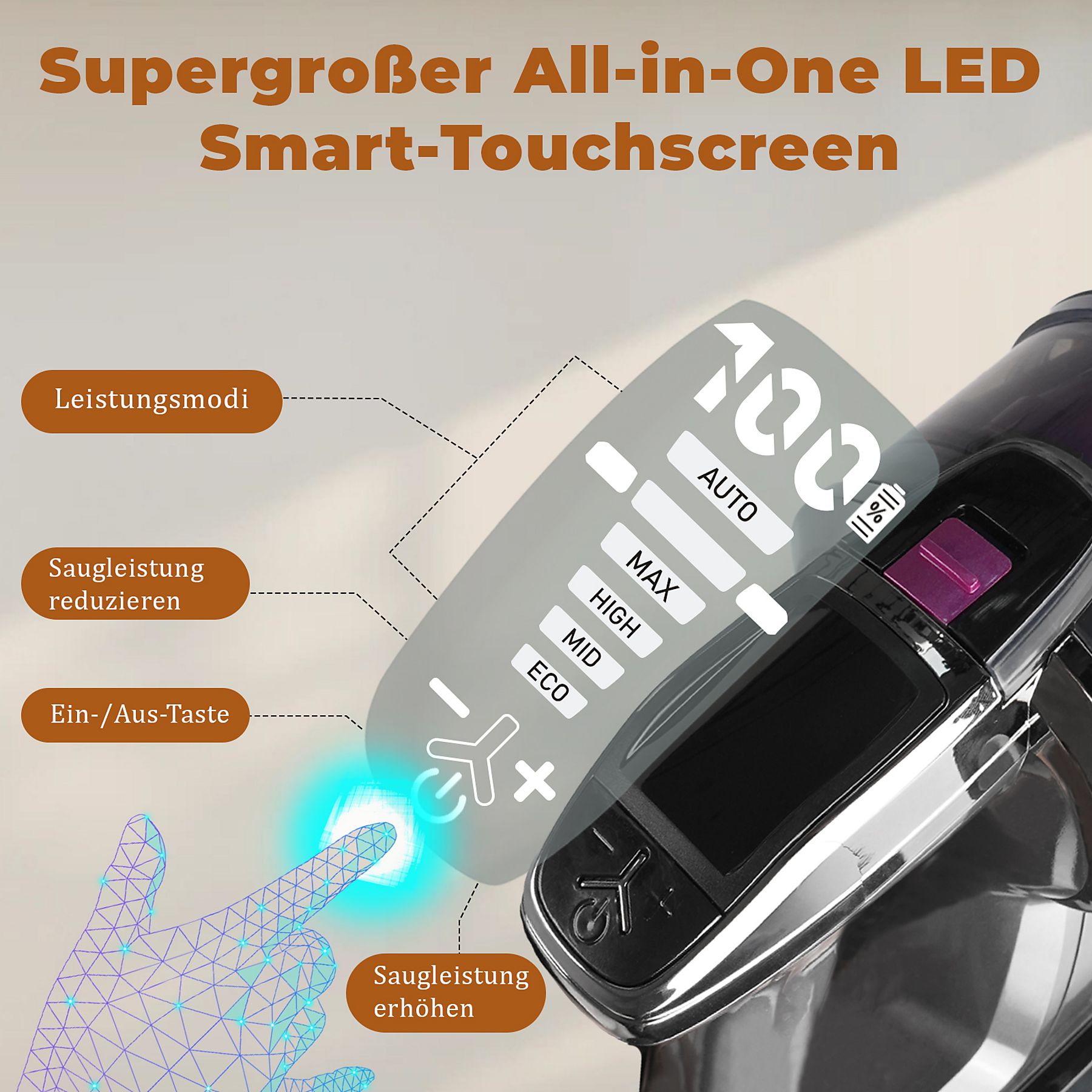 De draadloze stofzuiger is uitgerust met een verwijderbare accu van 8x2500 mAh met hoge capaciteit. Eén keer opladen is voldoende om een heel huis van 250 vierkante meter schoon te maken. Hij werkt tot 20 minuten in de maximale stand. Het grote kleuren-leddisplay toont 5 instelbare zuigstanden (EC0-MID-HIGH-MAX-AUTO) om aan uw dagelijkse schoonmaakbehoeften te voldoen. We bieden ook een oplaadstation aan de muur aan dat in slechts 4-5 uur volledig kan worden opgeladen.