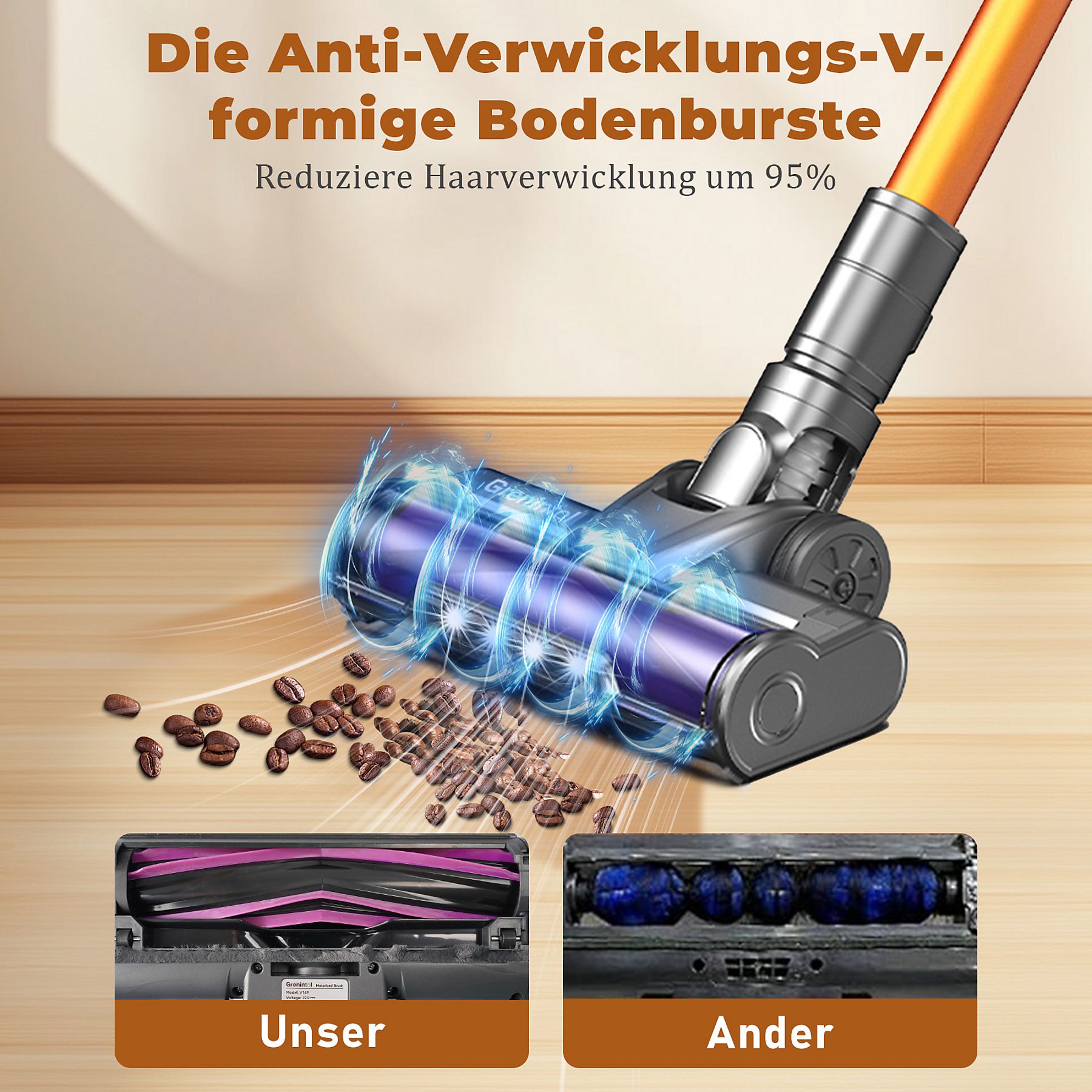 Deze draadloze steelstofzuiger is uitgerust met een V-vormige antiklitrol (rubberen borstel) die vastzittend vuil en dierenhaar van tapijten en vloeren verwijdert zonder dat ze in de knoop raken. Ideaal voor gezinnen met huisdieren. De tapijt- en vloerborstelkop van deze draadloze kruimelzuiger is 90°/165° draaibaar, zodat er geen moeilijk bereikbare plekken onder meubels of het bed meer zijn!
