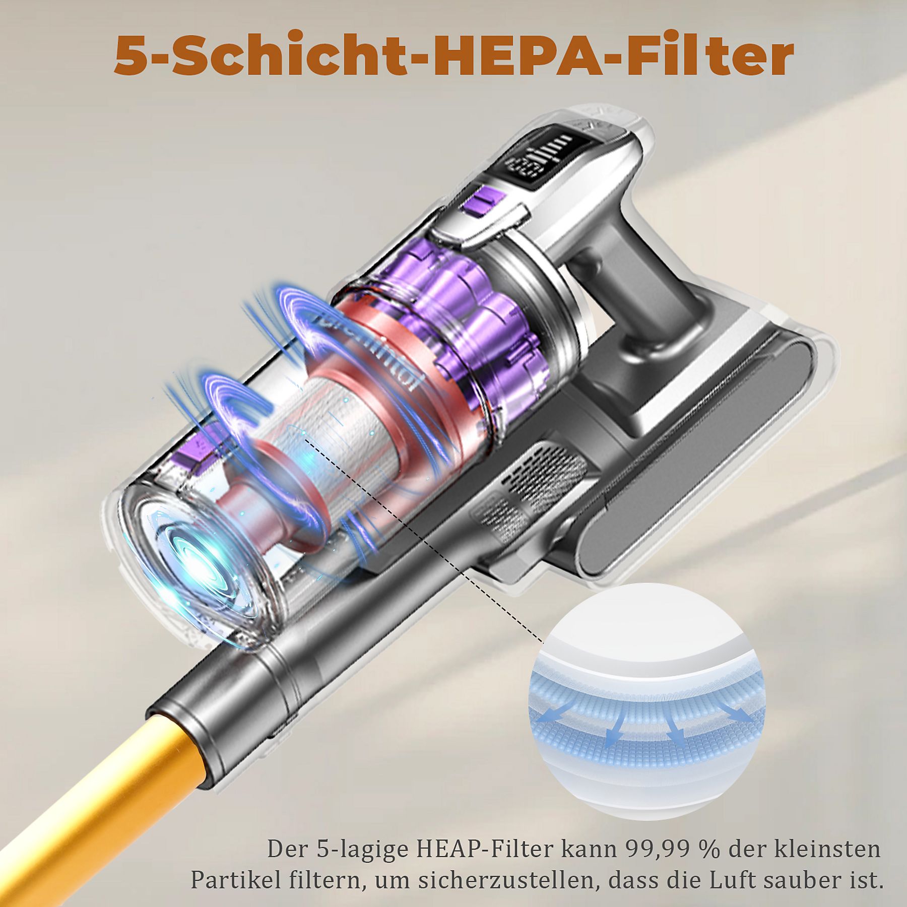 Het cycloonfiltersysteem verwijdert fijnstof en zorgt ervoor dat de uitblaaslucht 99,9% zuiver is. Het HEPA-filter van de draadloze stofzuiger is wasbaar. Spoel het eenvoudig af en na het drogen is het herbruikbaar, wat het zowel milieuvriendelijk als zuinig maakt. We leveren ook drie reservefilters, zodat u altijd optimale prestaties hebt tijdens het stofzuigen. Kies voor onze stofzuiger om frisse lucht in huis te halen.