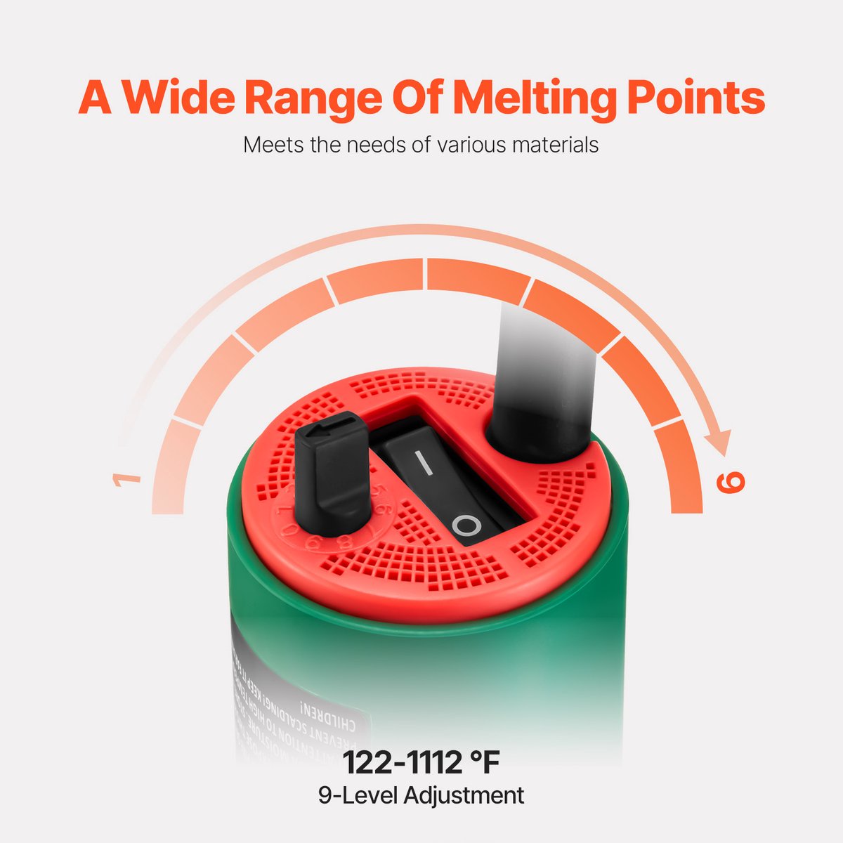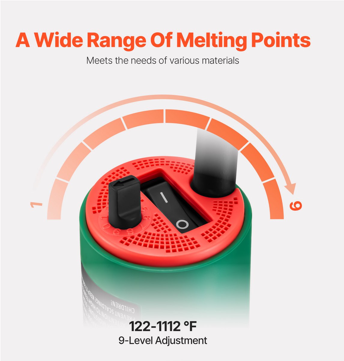 - Instelbare temperatuurregeling: pas de temperatuur eenvoudig aan van 50°C tot 430°C met een draaiknop met 9 standen. Dit lasapparaat is perfect voor diverse materialen en de hittebestendige handgreep zorgt voor veiligheid en comfort tijdens gebruik.