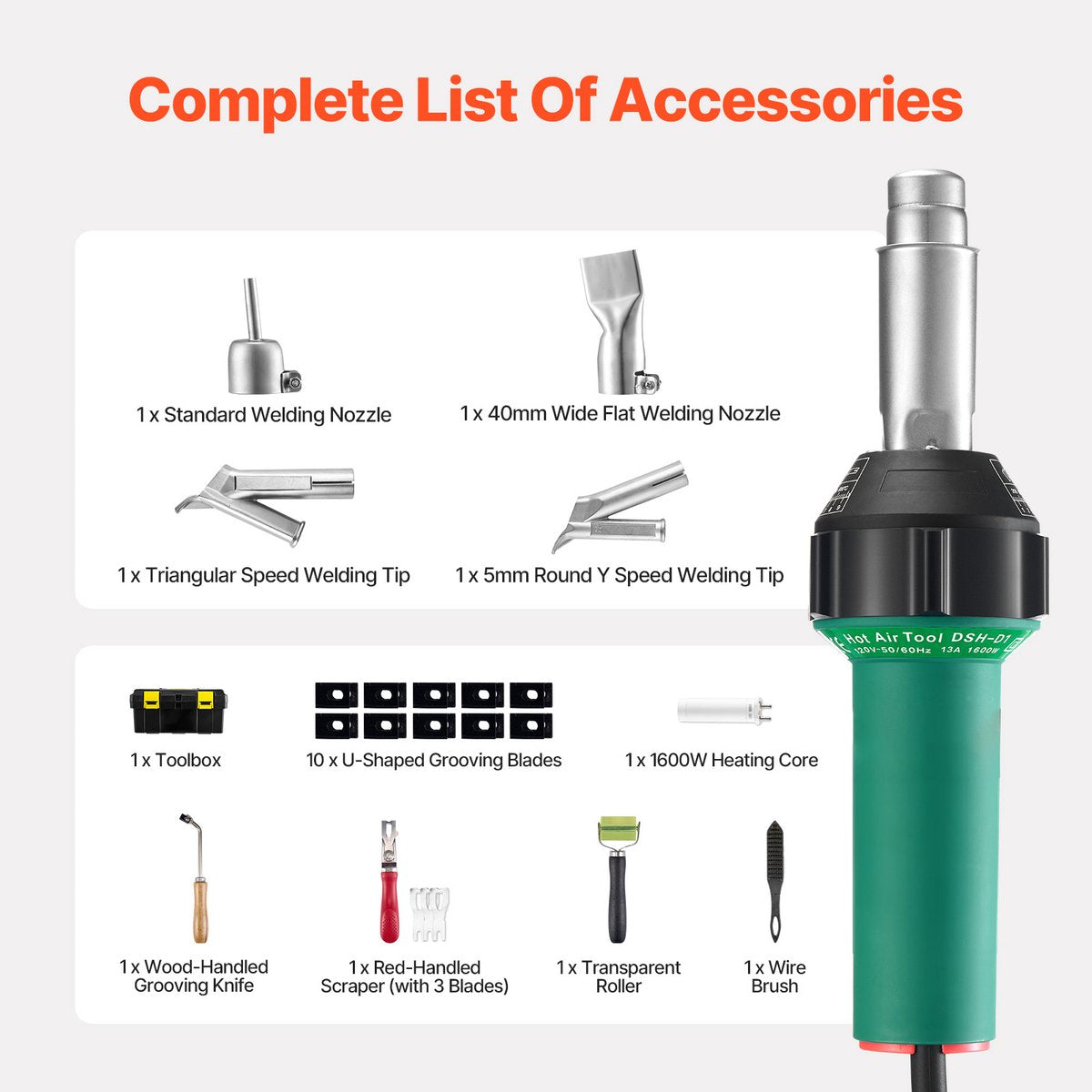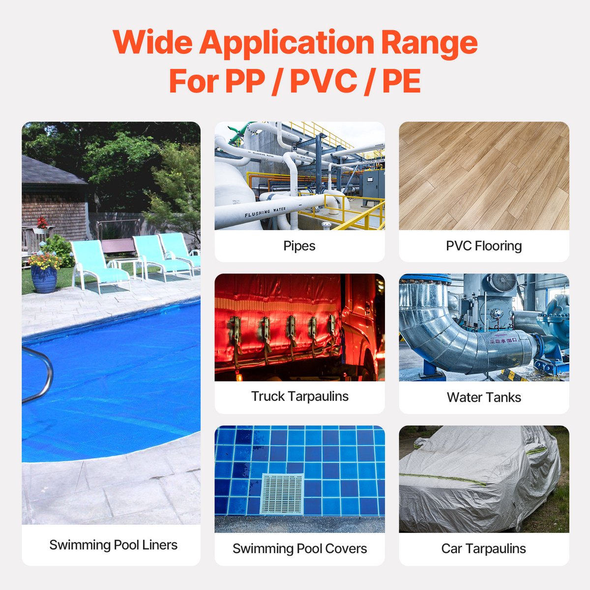 - Breed scala aan toepassingen: Perfect voor het repareren van PVC-, PE-, PP- en PVDF-materialen, waaronder zeilen, kajaks, zwembaden, TPO-daken, autobumpers en meer. Een veelzijdig gereedschap voor reparaties thuis, auto's en professioneel gebruik.