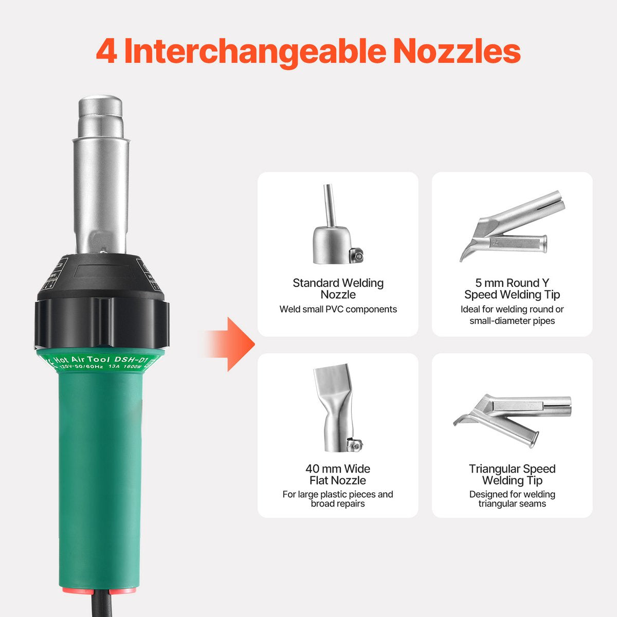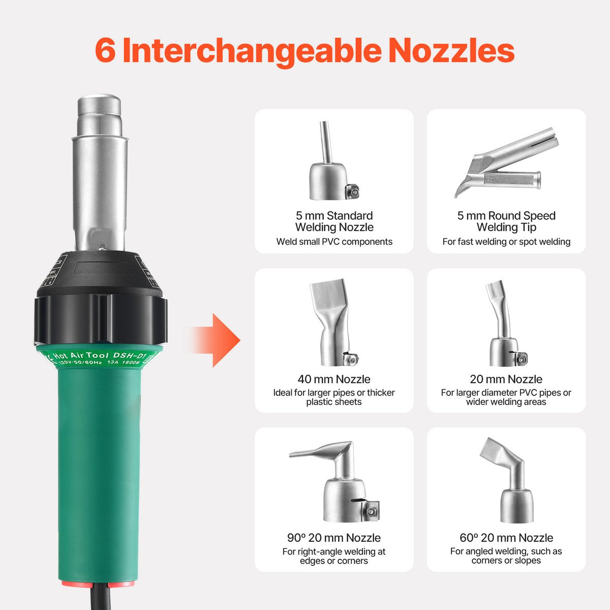 Het lasapparaat wordt geleverd met 6 verschillende mondstukken, waardoor u flexibel kunt zijn voor verschillende taken. Of u nu nauwkeurig PVC-buizen last of grotere reparaties uitvoert, zoals zeilen, u kunt de mondstukken eenvoudig aanpassen aan de klus.
