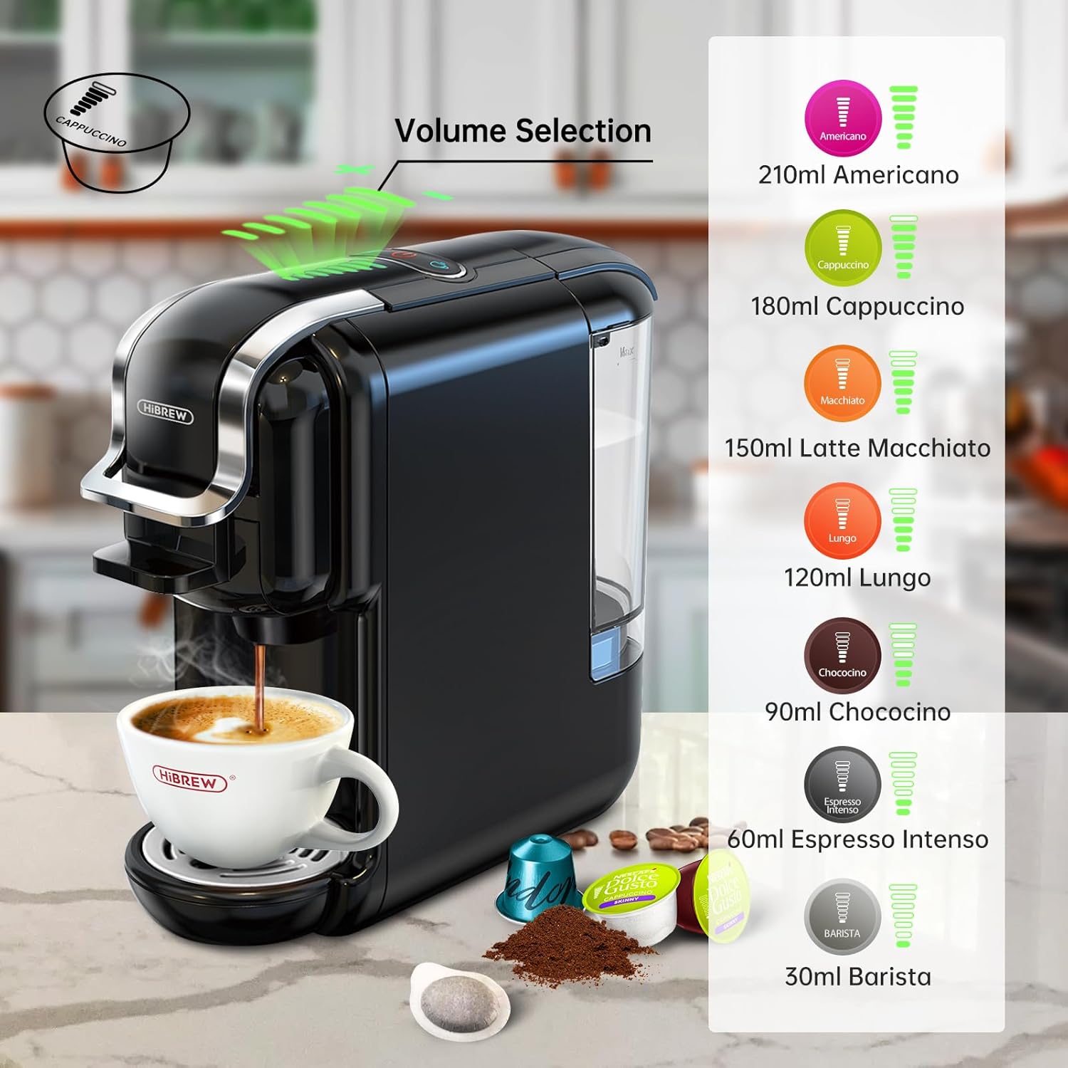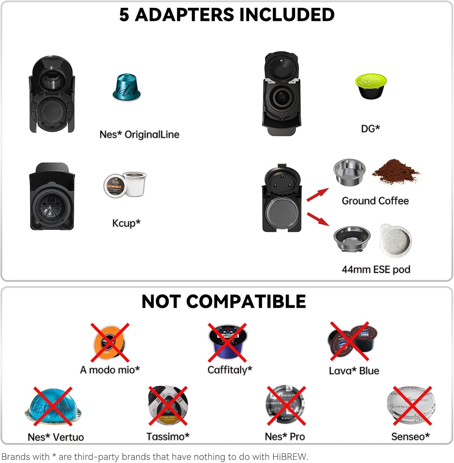 Hibrew H2B 5-in-1 capsule koffiezetapparaat - Ondersteunde koffiesoorten: Nes-capsules, DG-capsules, ES*-koffiepads, K-Cu* (4 adapters inbegrepen) - Waterpomp van 19 bar - Automatische uitschakelmodus na 15 minuten - Koud-/warmmodus en LED-kookindicator - 7 niveaus van het koffiearoma - 600ml BPA-vrij waterreservoir - 222 ml 0 V, 14 V. 50 W - 245 x 245 x 110 mm, 2,8 kg