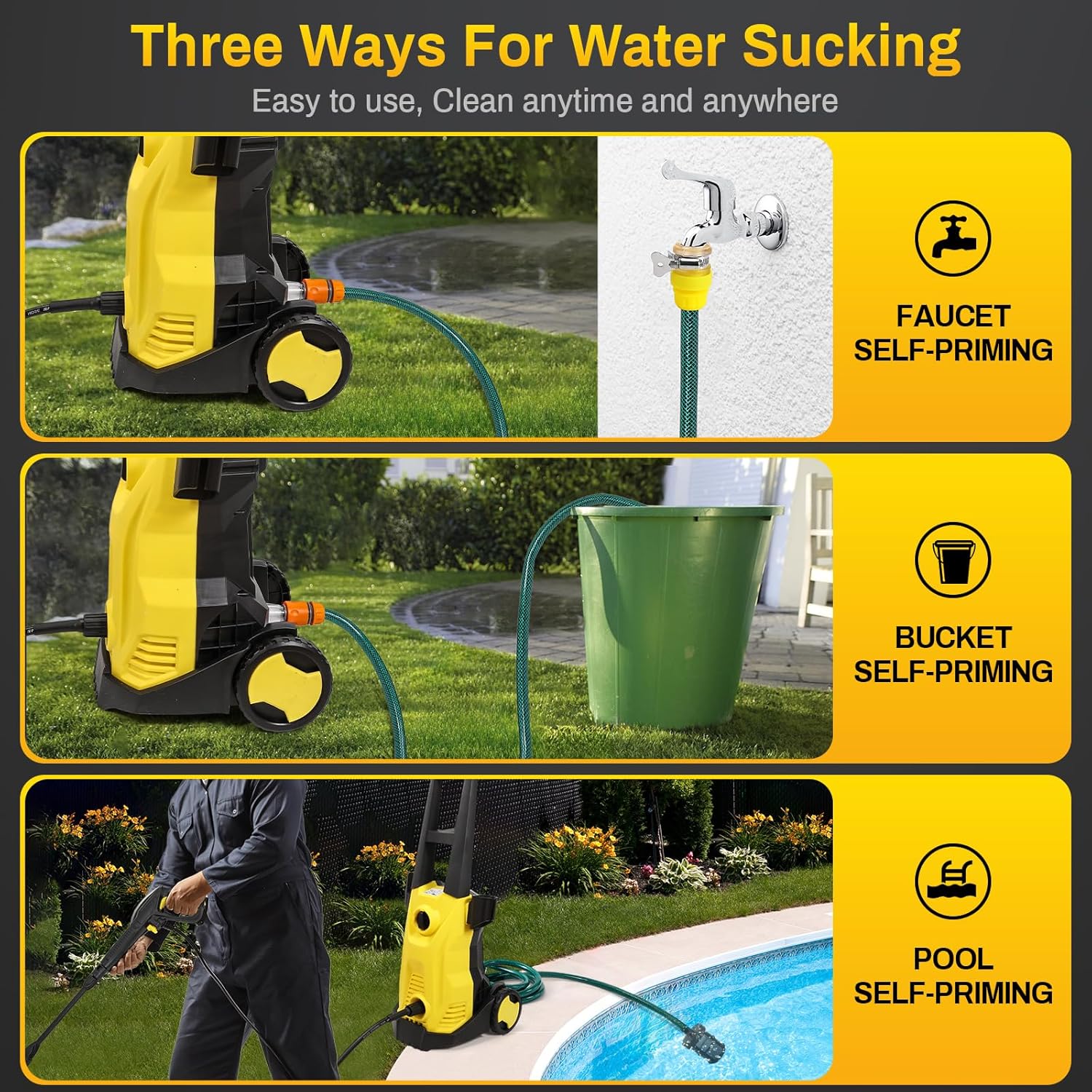 Eenvoudig op te bergen: onze hogedrukreiniger heeft een opbergdoos aan de zijkant en een haak aan de zijkant waar verschillende accessoires gemakkelijk kunnen worden opgeborgen, zodat u zich geen zorgen hoeft te maken over het ontbreken van de benodigde accessoires en voldoet aan uw eisen voor veelzijdig gebruik.