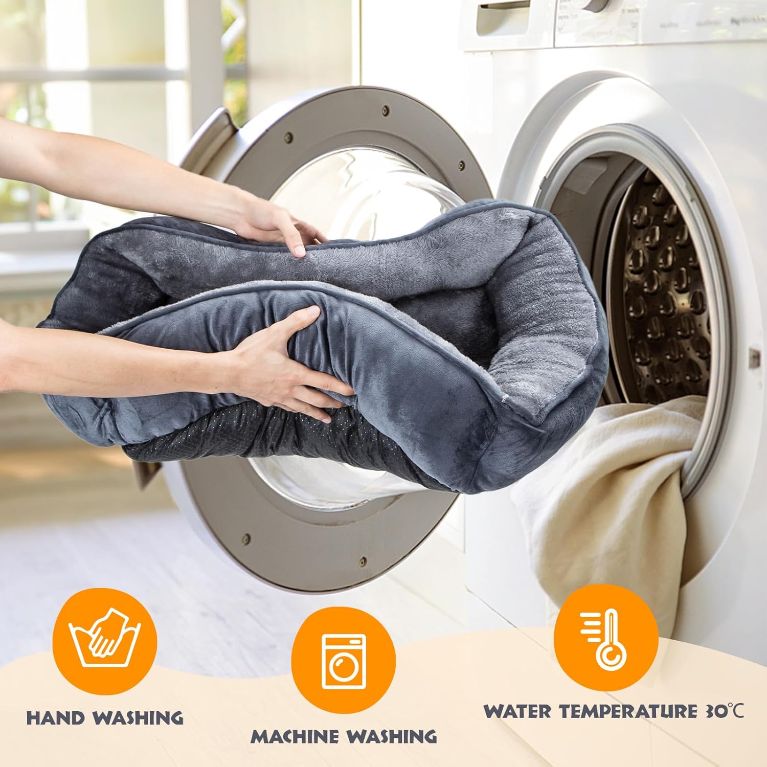 Verhoogde randen voor een goede grip: de verhoogde, goed gevoerde randen van de hondenmand ondersteunen het hoofd en de nek van je harige vriend, wat hem een gevoel van veiligheid geeft en een comfortabele slaaphouding mogelijk maakt.