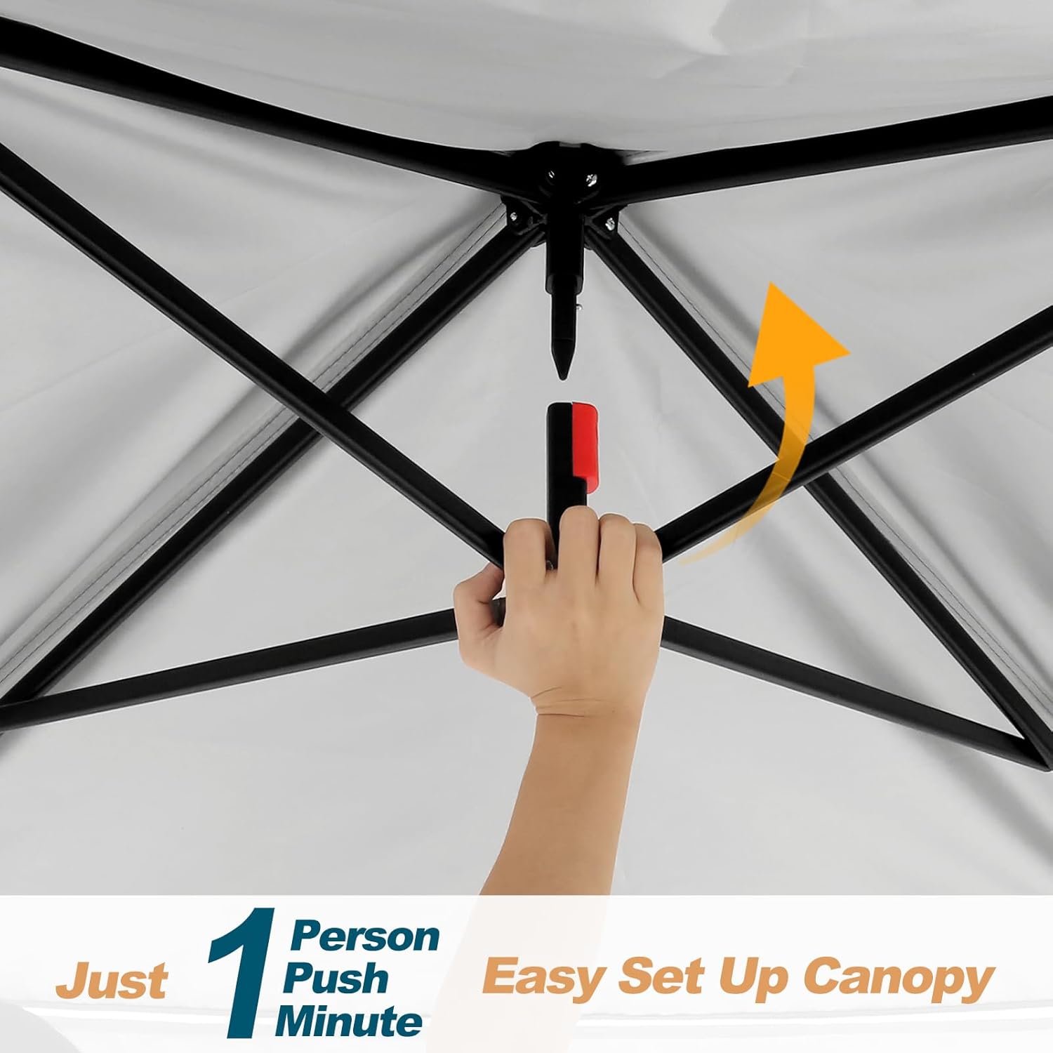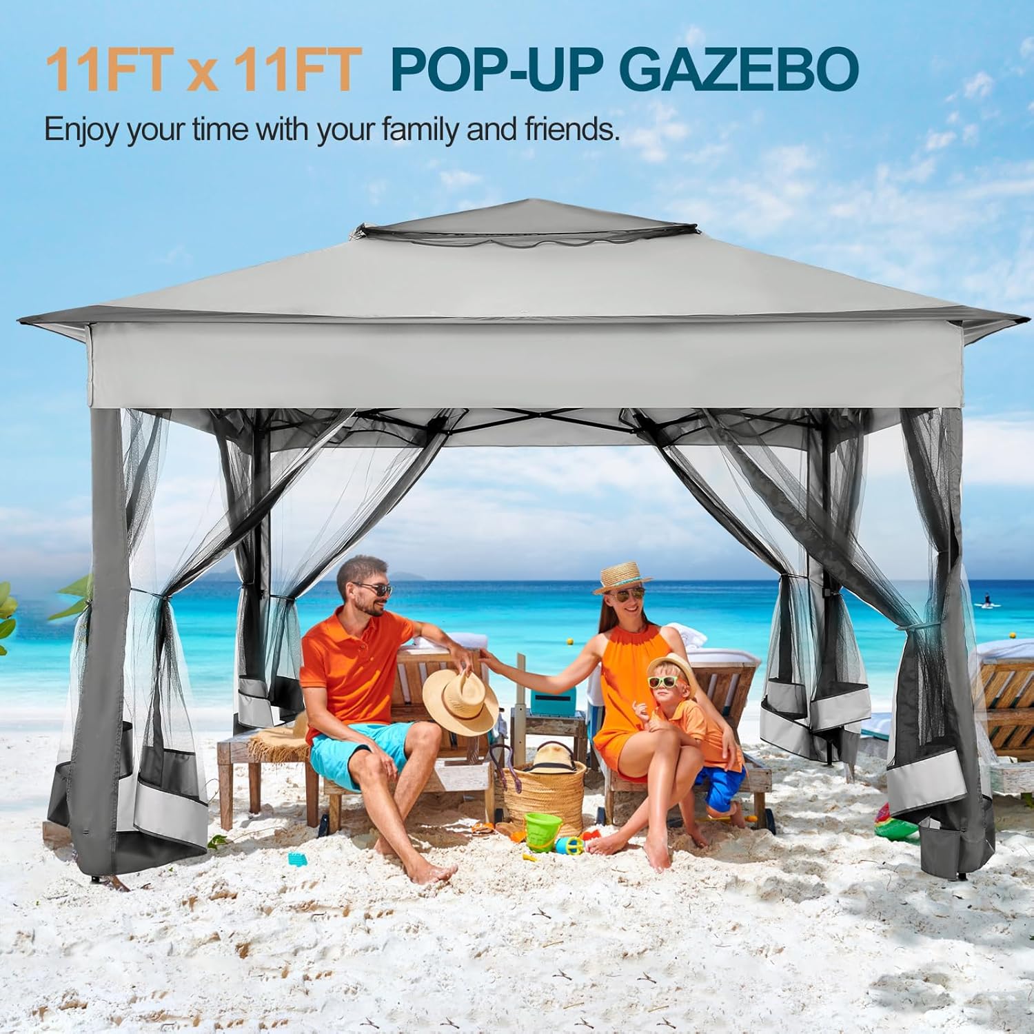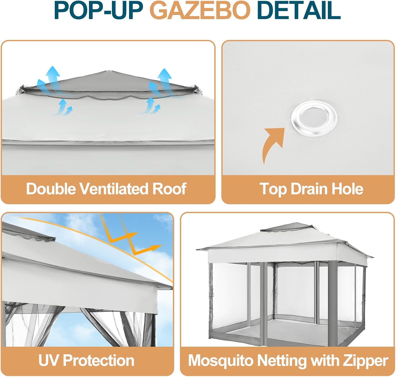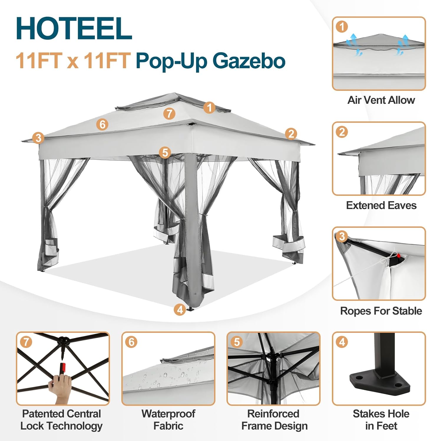 【Grote Gazebobasis】Onze pop-up gazebo 10 x 10 heeft rechte stalen poten en een verlengde structuur rond de eaves van de tent en biedt extra schaduwbedekking. De 11 x 11 gazebo top biedt je 121 vierkante voeten dekking, die 4 tafels of 6-8 mensen tegelijkertijd kunnen accepteren.