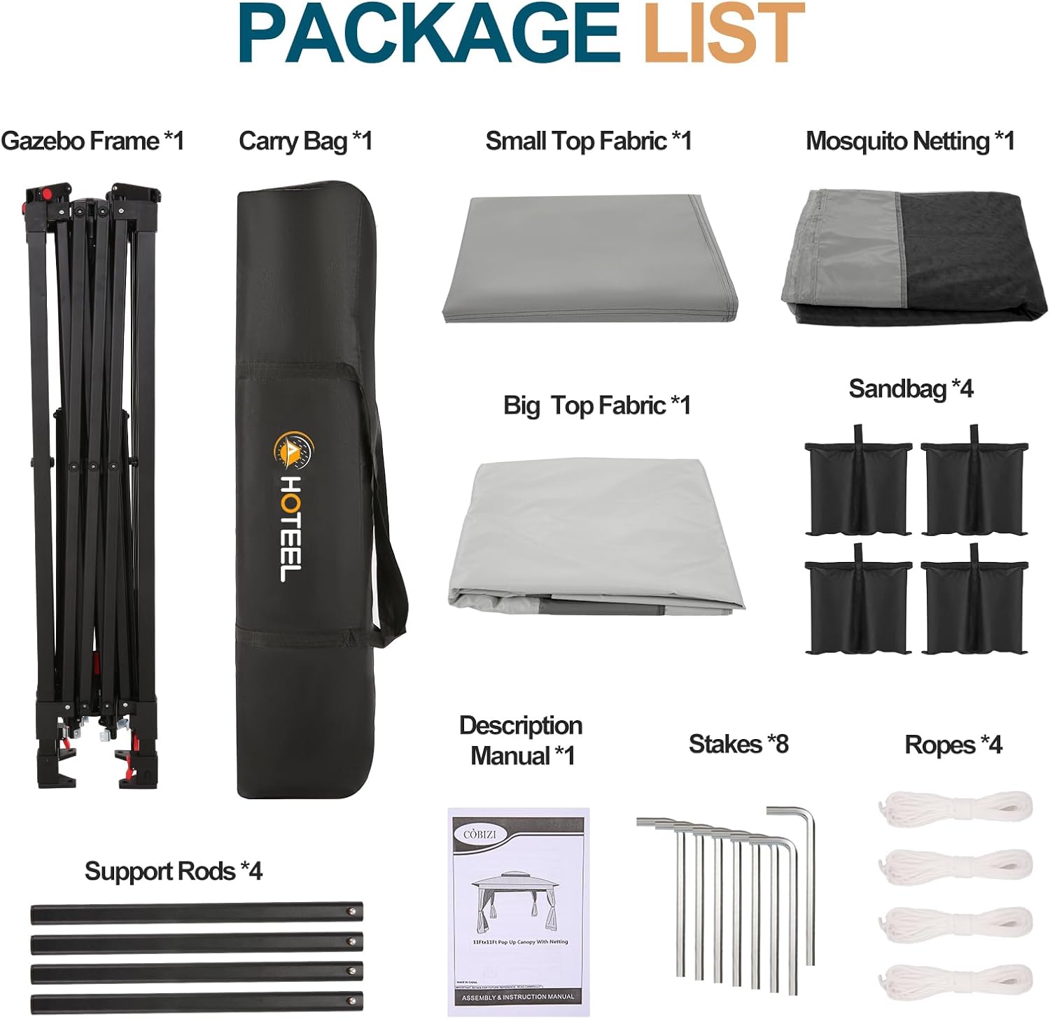 Stevig metalen frame: gemaakt van dikke en langere metalen buizen met sterke metalen telescopische verbinding, onze outdoor gazebo 10 x 10 toont stabiele prestaties, bereikt meer wind- en stabielere effecten. Het top-kwaliteit frame is gemaakt van speciaal staal met roestbestendige poedercoating, hoogwaardige anti-roest en anti-corruptie mogelijkheden.
